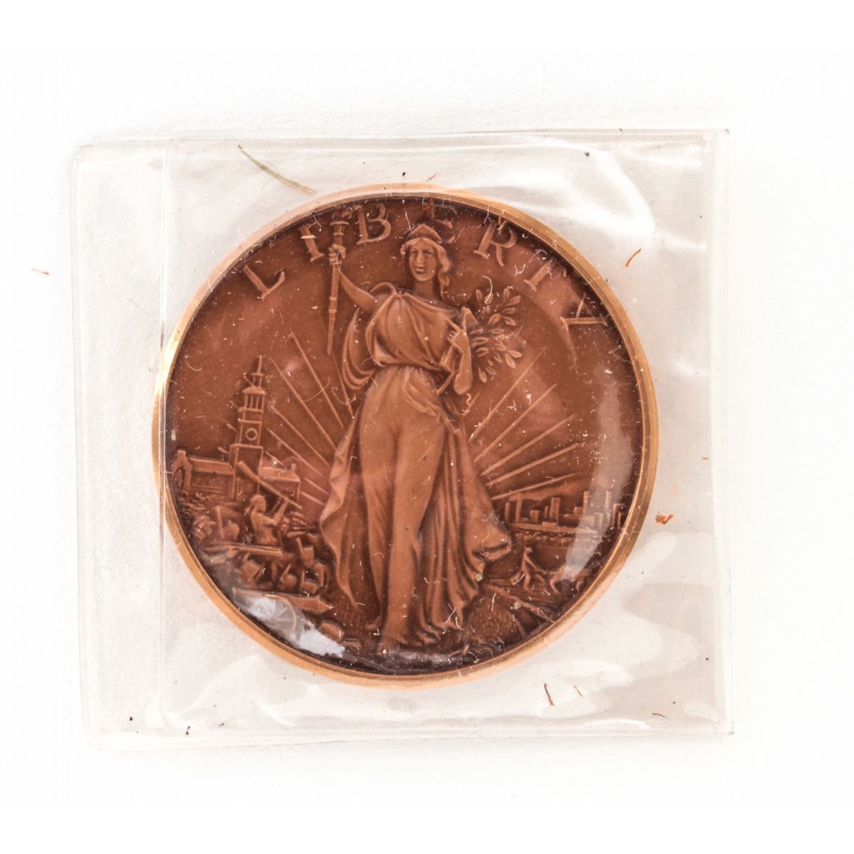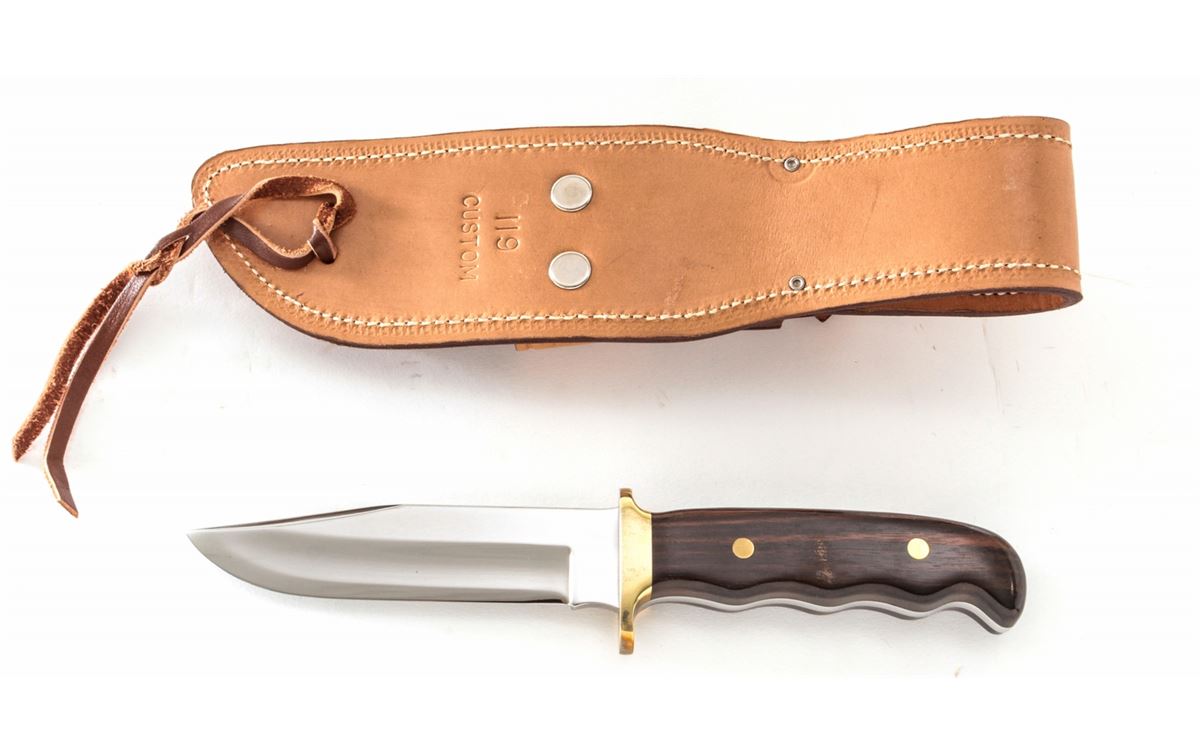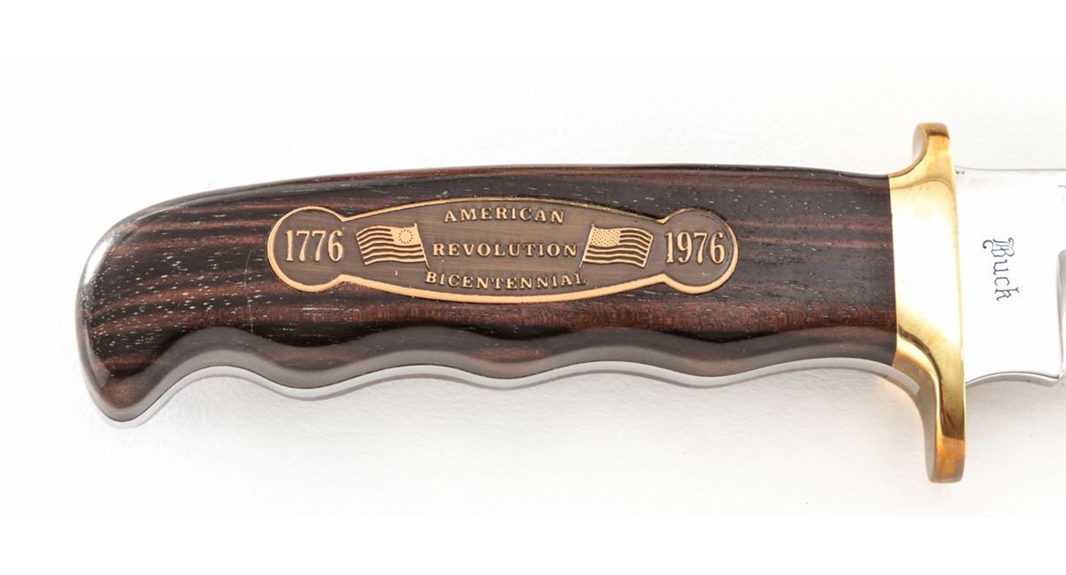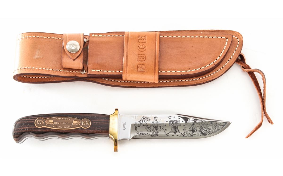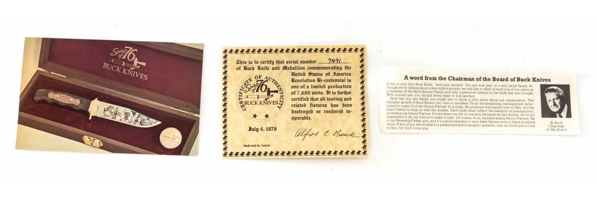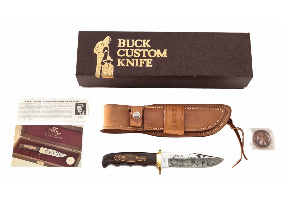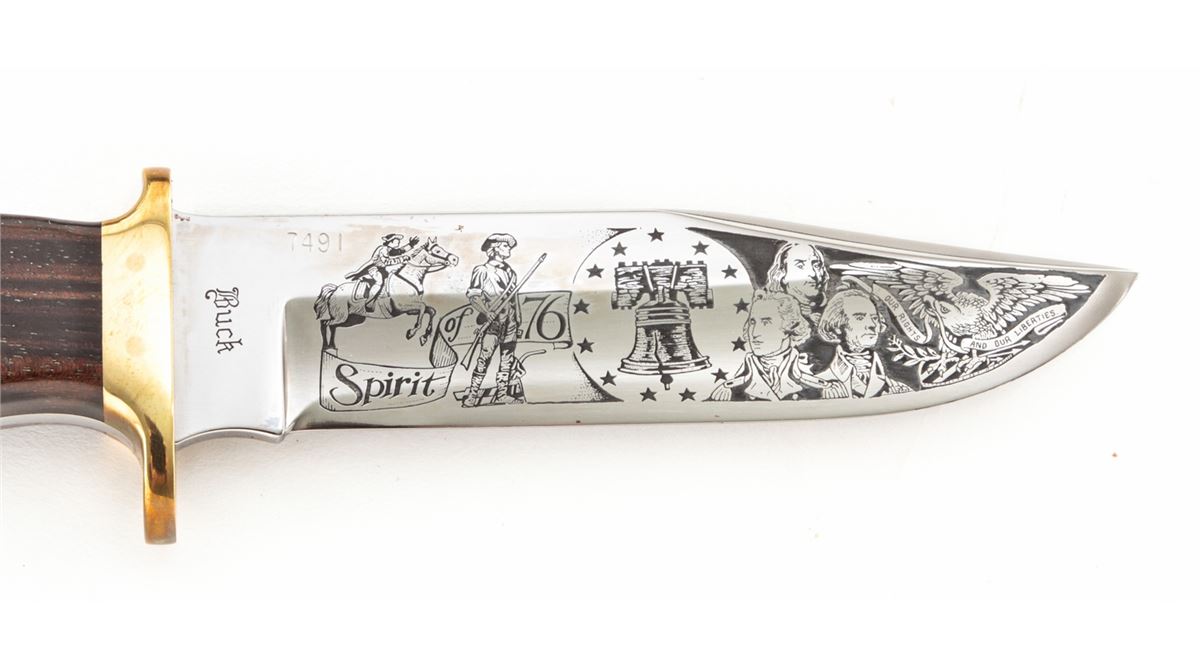 Custom Buck ''Spirit of 76'' Fixed Blade Knife, #7491, 5'' etched blade depicting the Liberty Bell, American Eagle, Paul Revere, etc., 9-3/4'' overall, wood grips with an inlaid plaque that reads ''American Revolution Bicentennial 1776-1976''. Features brass guard, leather sheath, original box, CoA, post card, and coin with matching serial number. Condition is excellent and as new. Guard with mild toning and micro-scratching. Wood grips with light marks from handling. Est.: $125-$250.