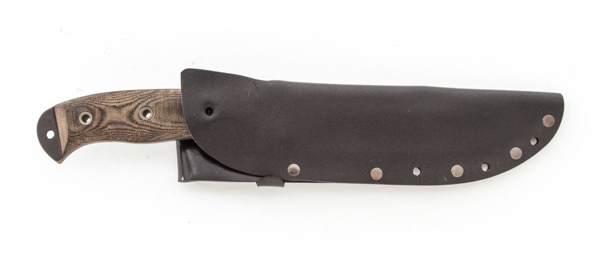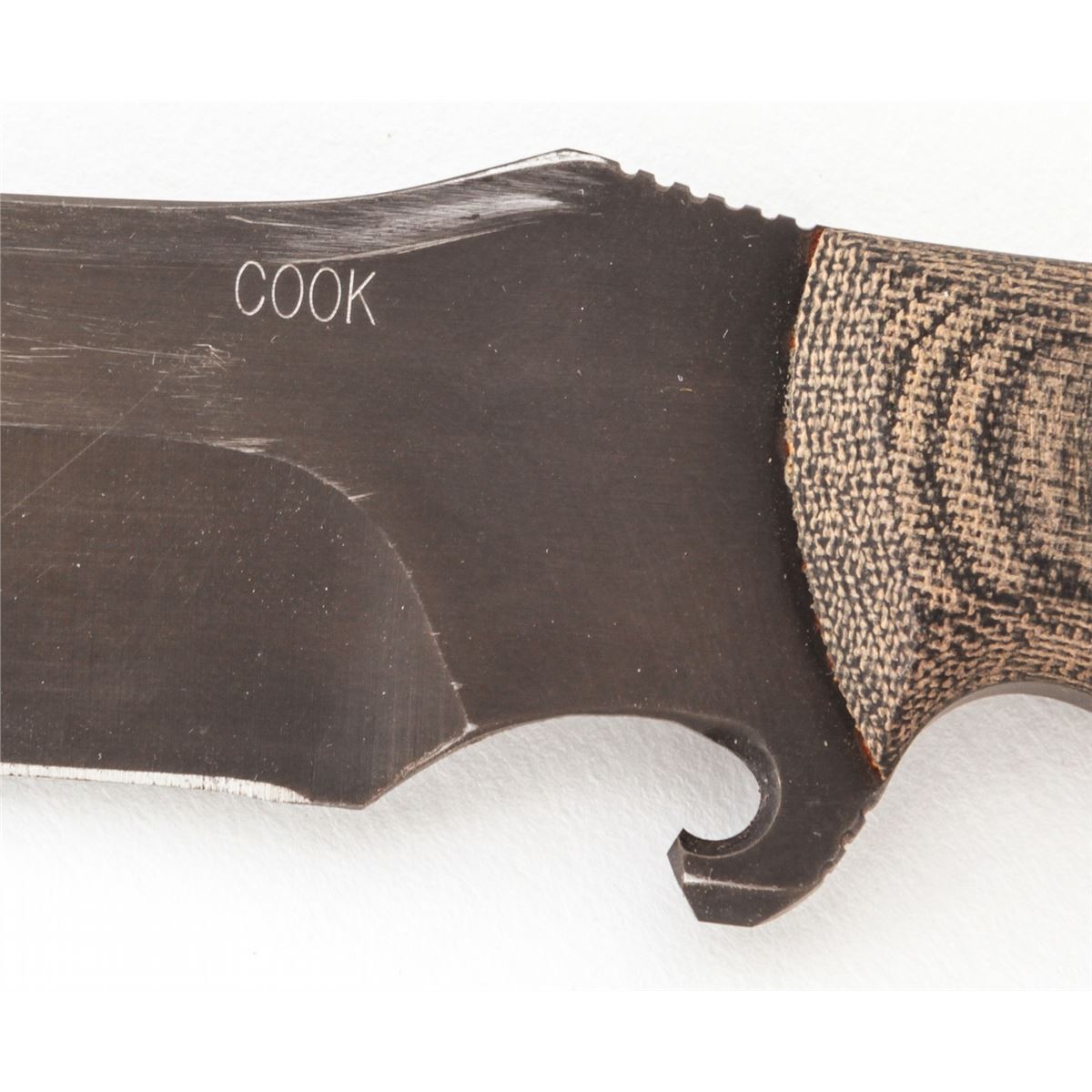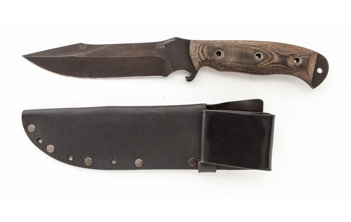 Fixed Blade Fighting Knife, by Dennis Cook, 6-1/2'' matte finish blade, 11-5/8'' overall, partially grooved spine for thumb support, green micarta grips, lanyard hole, with black kydex sheath. Condition is fine overall, showing signs of light use. Blade retains factory edge with thinning, scuffs and scratches to matte finish. Handle with light darkening which appears to be caused by contact with the kydex sheath. Est.: $150-$250.