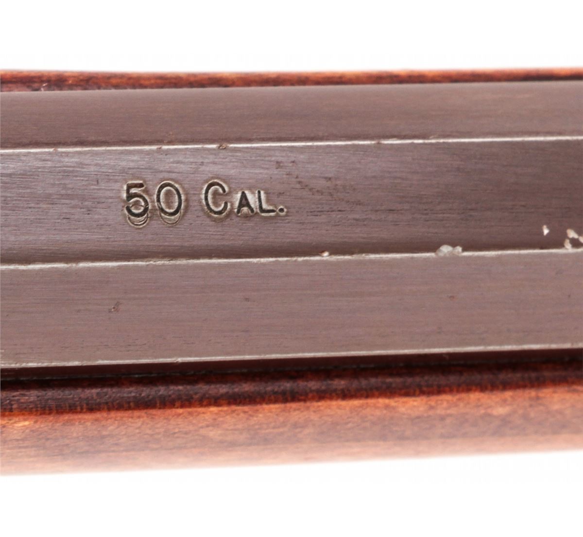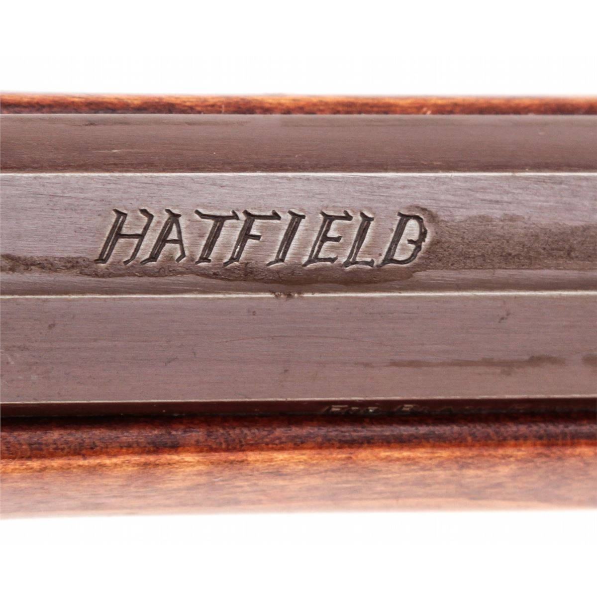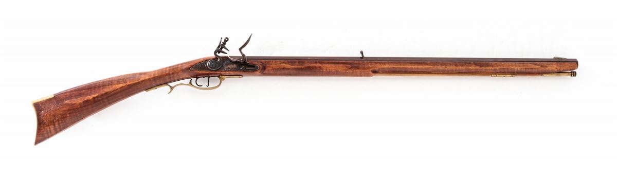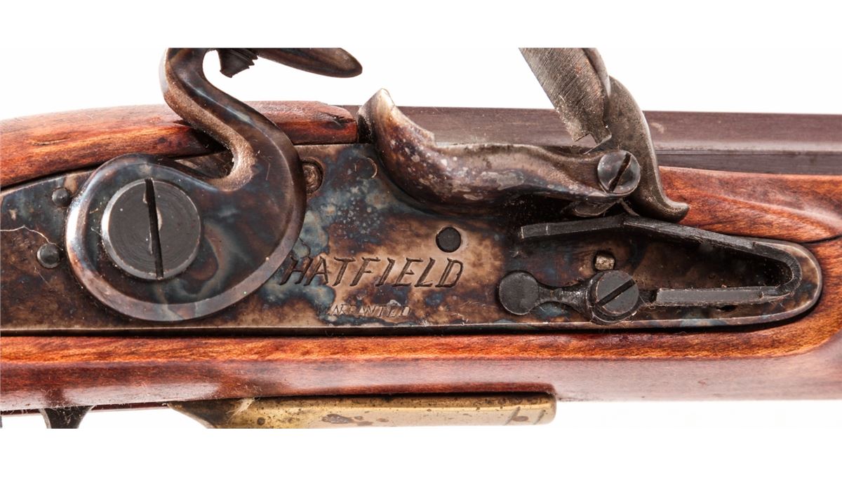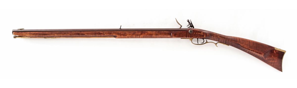 Modern Flintlock Rifle, by Hatfield, NVSN, .50 cal., 29-1/2'' octagonal barrel, full-length dark stained birch stock, with double set trigger and cast brass furniture. Condition is very good to near fine retaining approx. 92% brown finish to barrel with scuffs and scratches. Pennsylvania style stock with light pressure marks. There is a crack just in front of lockplate. Good functioning set trigger. Est.: $200-$400. (Antique)