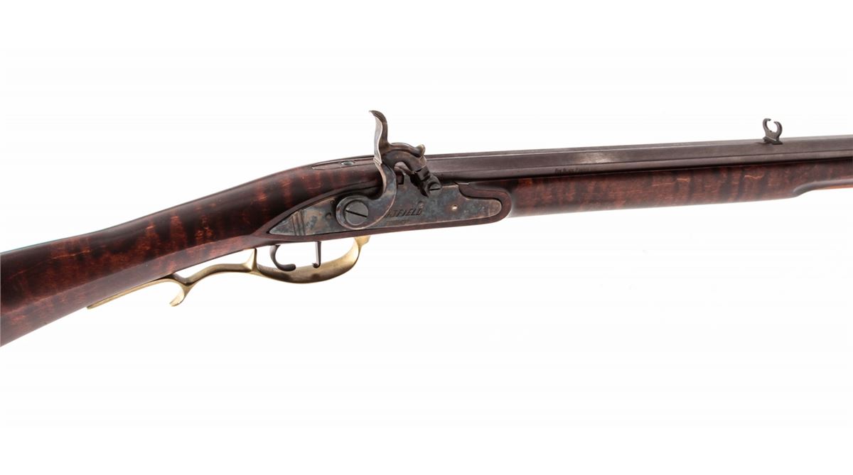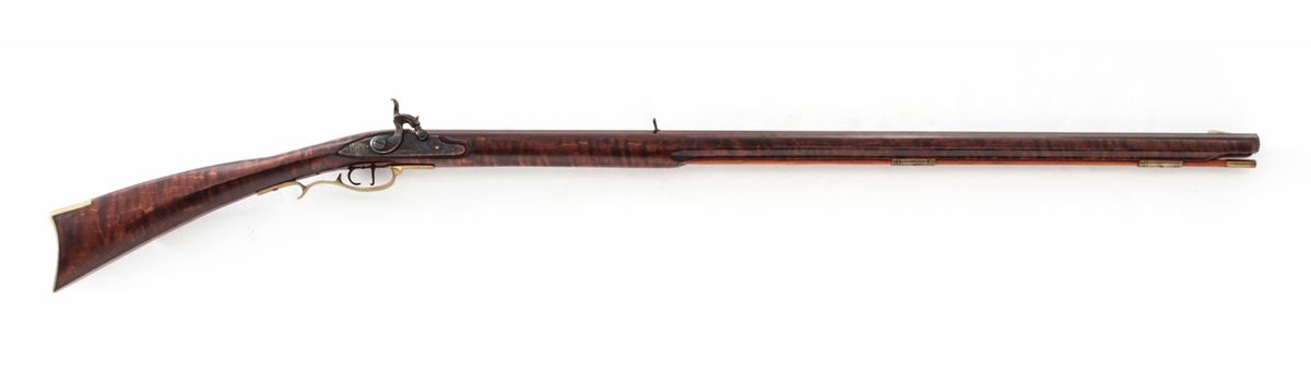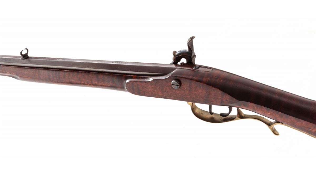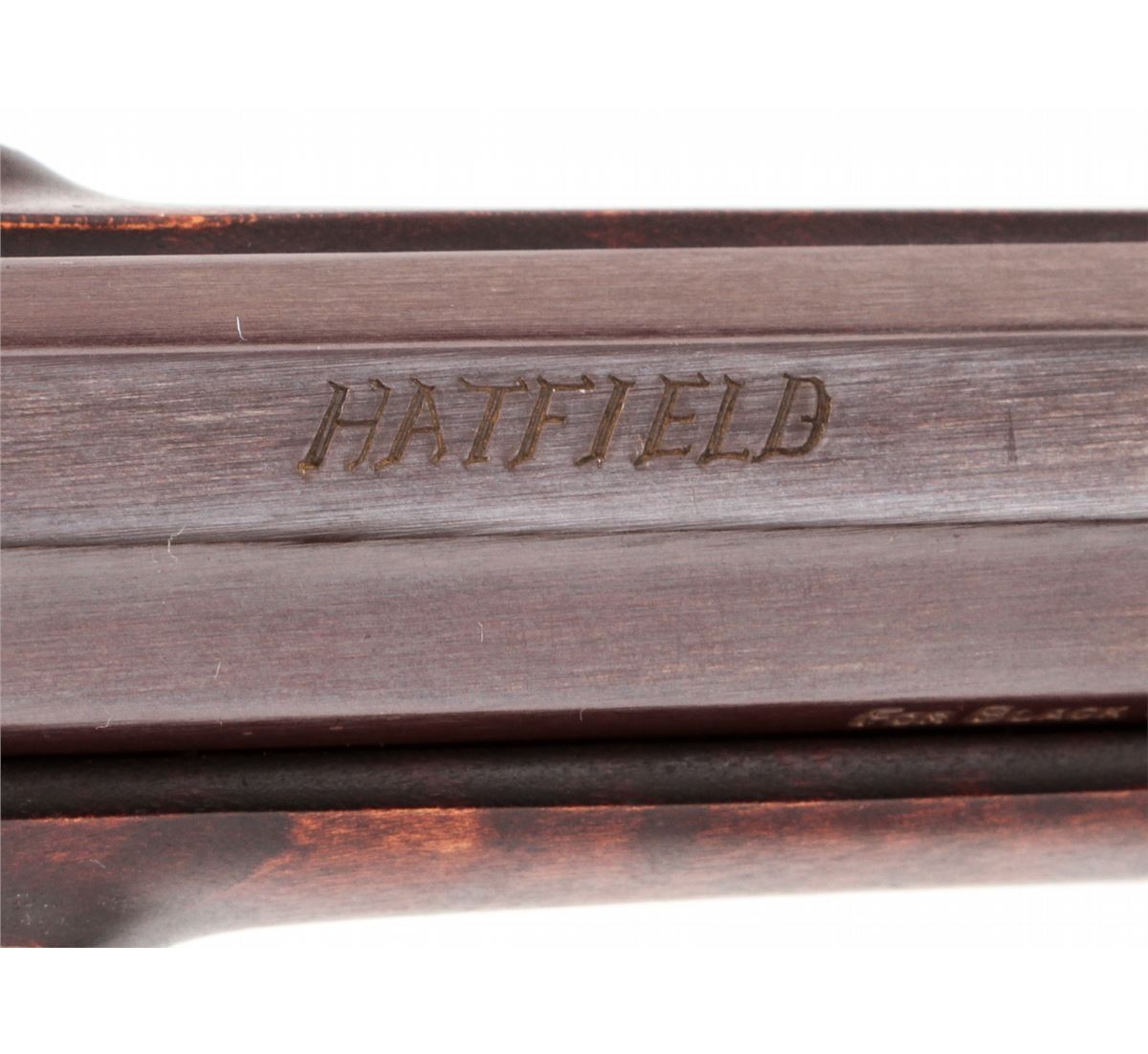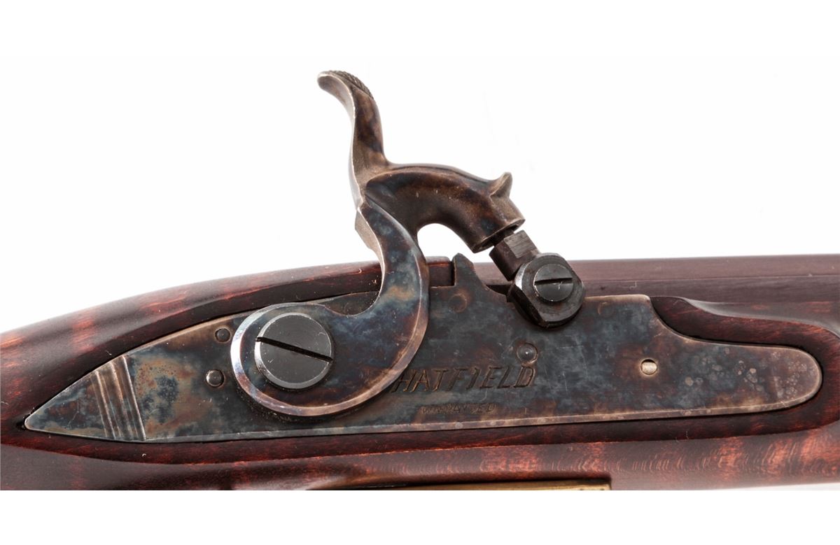 Hatfield Percussion Rifle, NVSN, .50 cal. ball, 39'' octagonal barrel, brown finish, case colored lock and hammer, brass furniture, nickel silver front sight and buckhorn rear sight, dark stained birch stock. Newly mfg'd in the PA style with set triggers, and both lock and barrel flat marked ''Hatfield''. Condition is excellent showing only light marks from handling. Action is crisp, bore is bright, set triggers function correctly. A very nice semi-custom percussion rifle. Est.: $300-$500. (Antique)