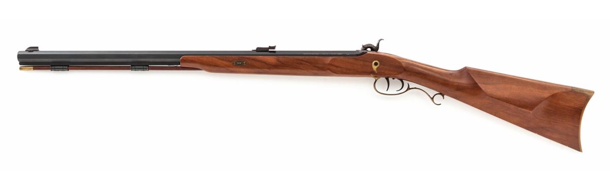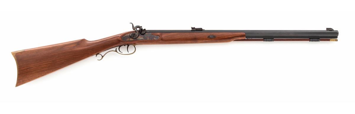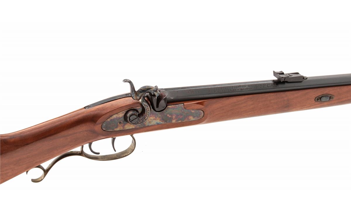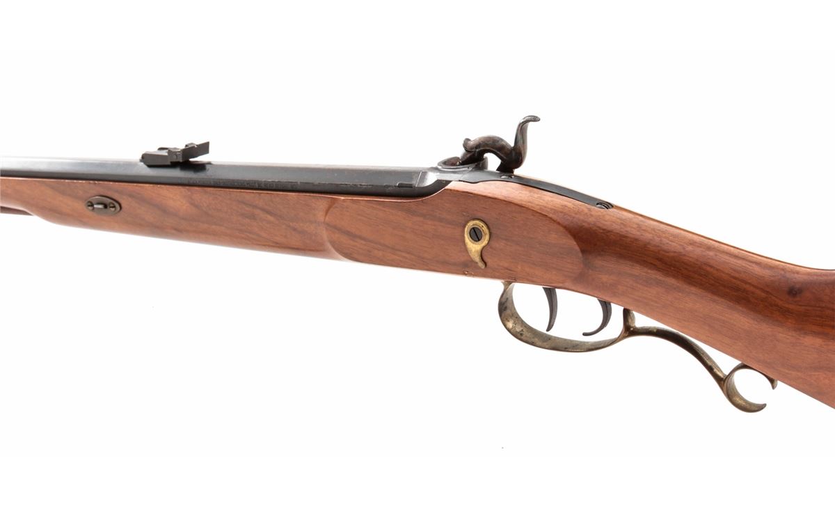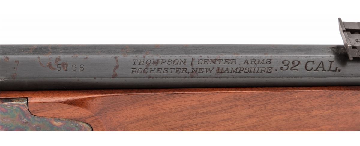 Thompson Center Percussion Rifle, #5196, .32 cal., 24'' octagonal barrel, blue finish, case hardened frame, brass triggerguard, double set trigger, with walnut stock. Condition is very good. Barrel with light corrosion near breech. Stock with light marks from handling. Good action and bore. Est.: $150-$300. (Antique)