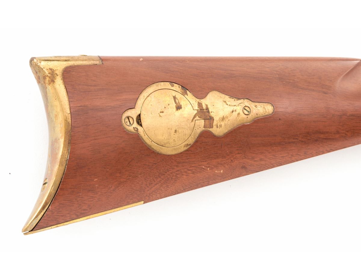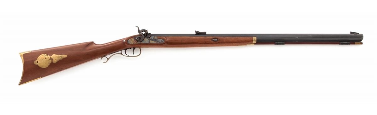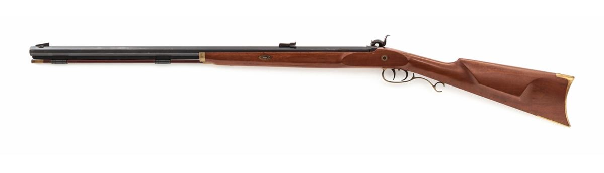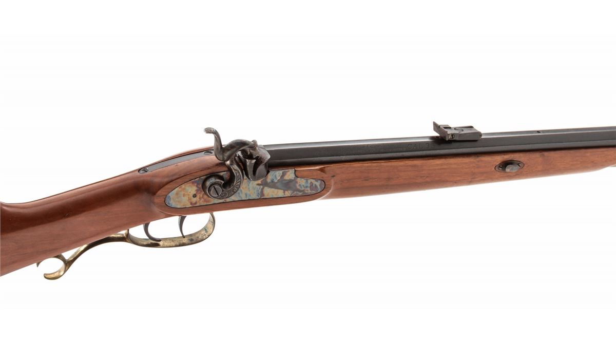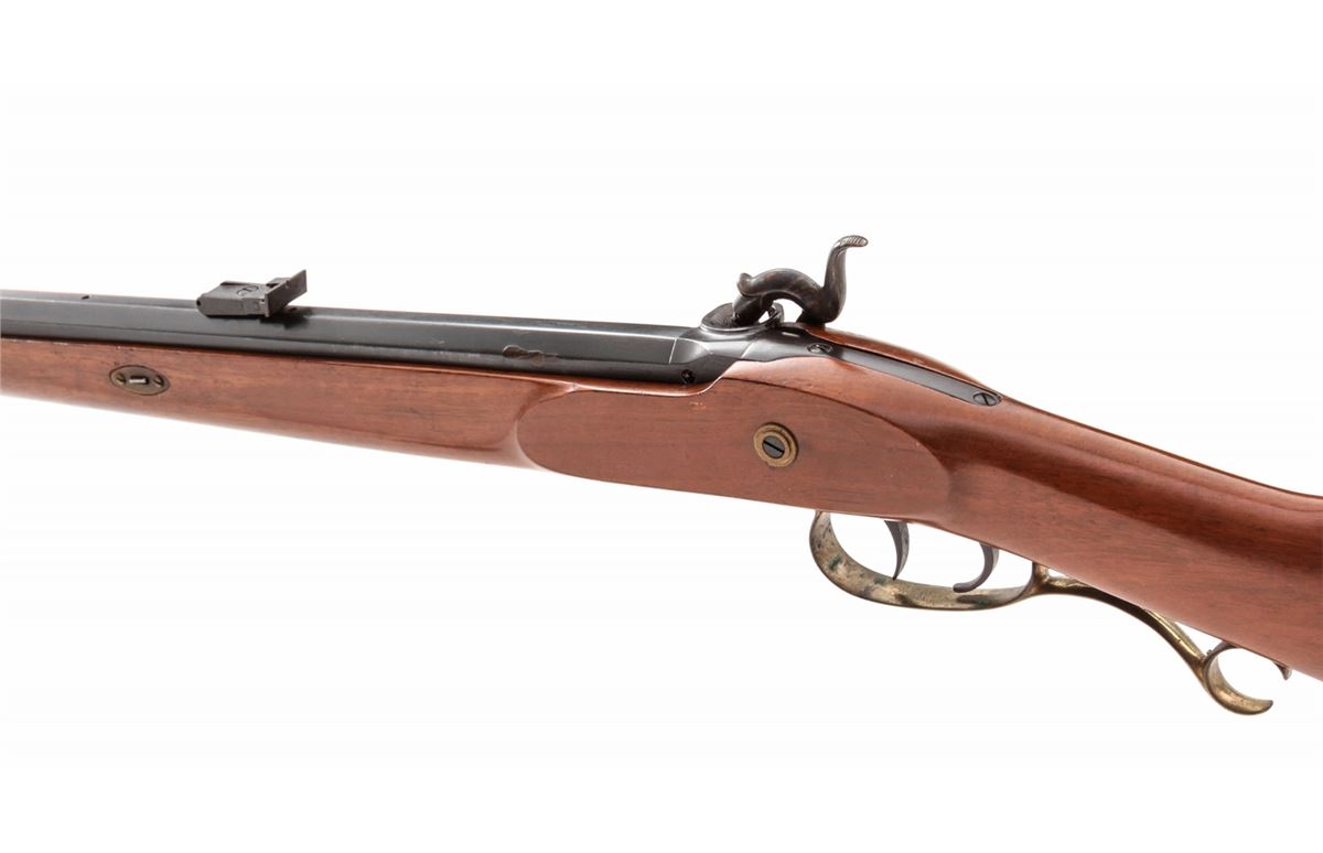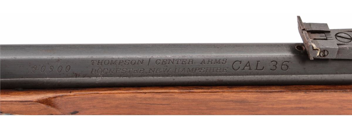 Thompson Center Percussion Rifle, #20900, .36 cal., 27'' octagonal barrel, blue finish, case hardened frame, brass triggerguard, double set trigger, with walnut stock. Condition is very good. Barrel with light thinning to finish. Holes to top flat where original rear sight was installed. Stock with light marks from handling. Good action and bore. Est.: $150-$300. (Antique)