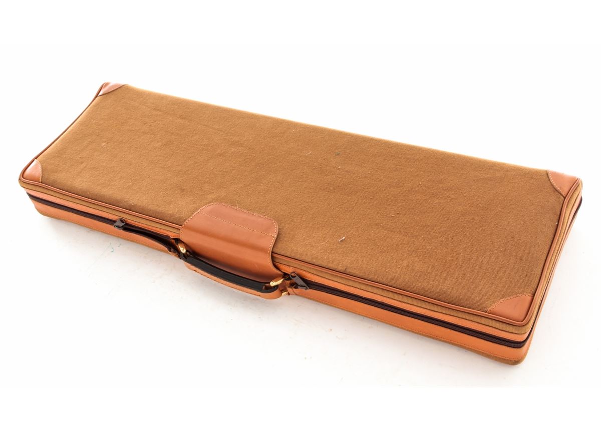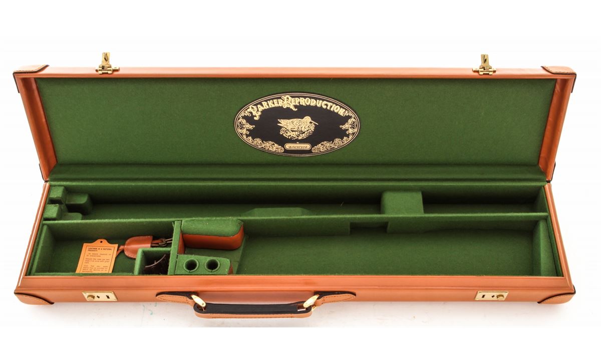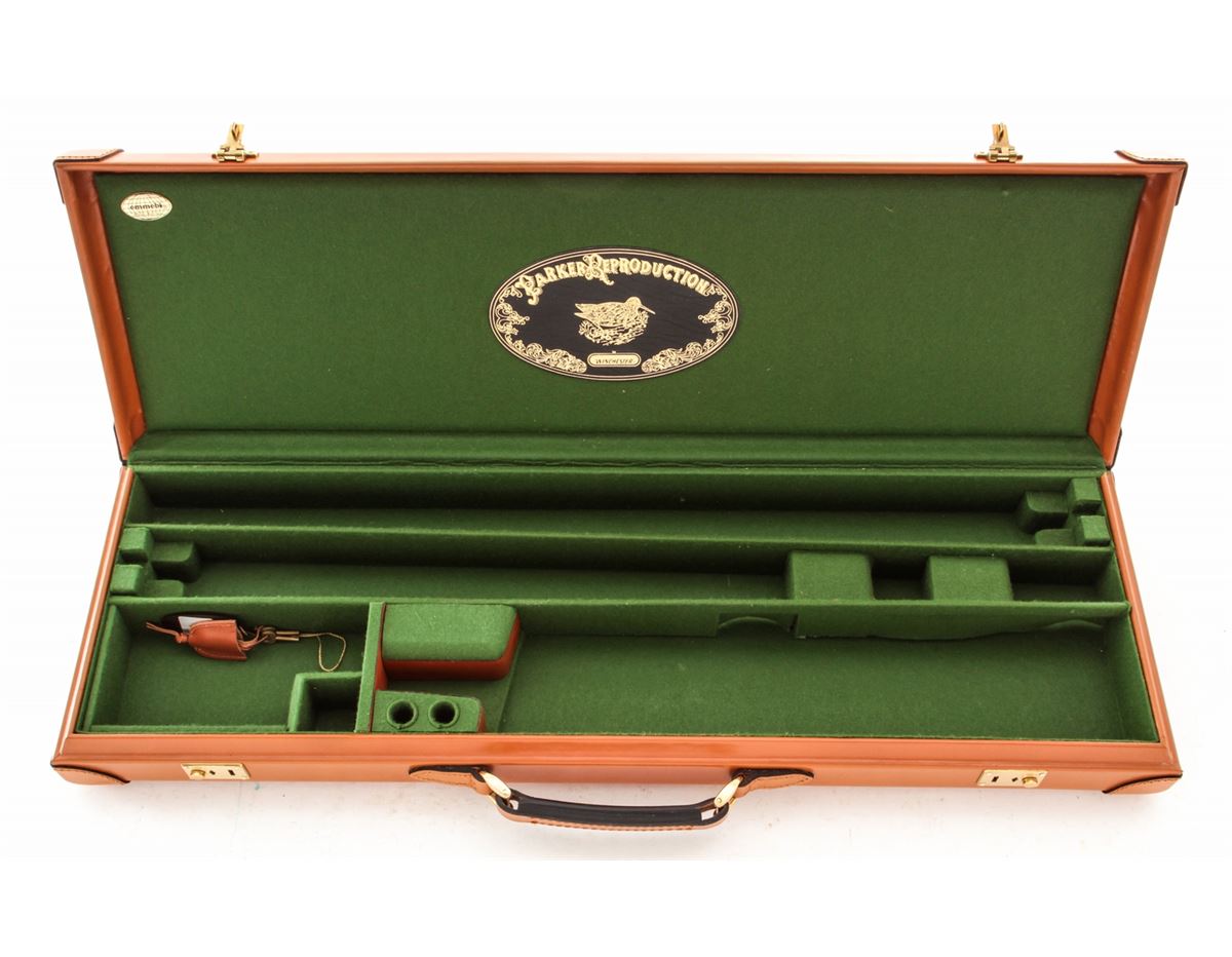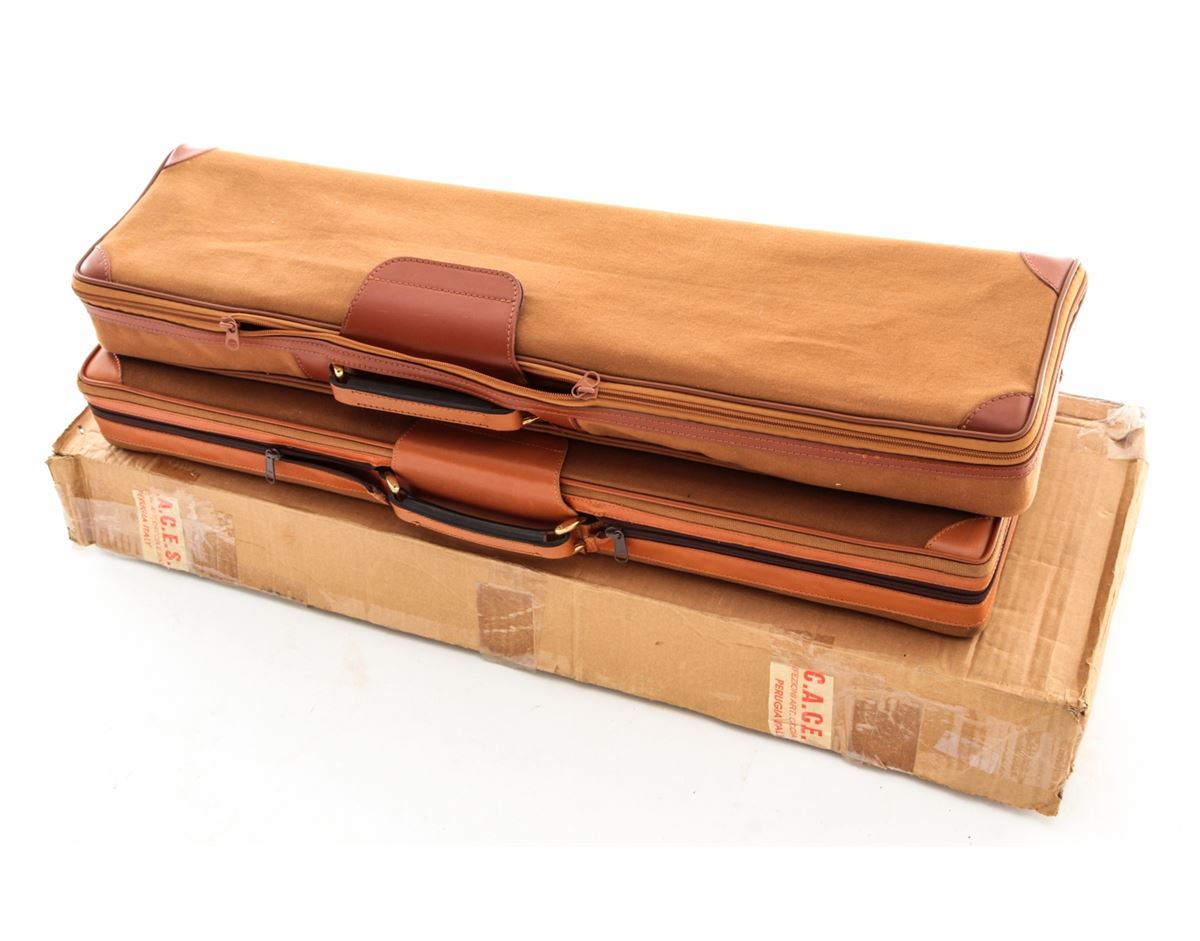 Two Parker Reproduction Emmebi Leather Luggage Cases, including one double case and one single case to each accommodate 20 ga. guns having 28'' barrels, both cases having their original fabric outer covers, Emmebi tags and two keys. Cases appear unused with the double case remaining in its Italian shipping box. Est.: $350-$500/lot.