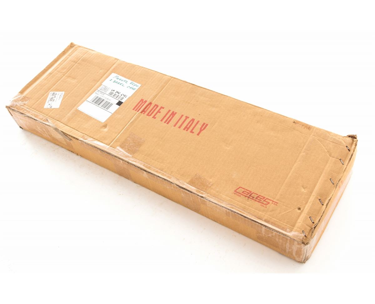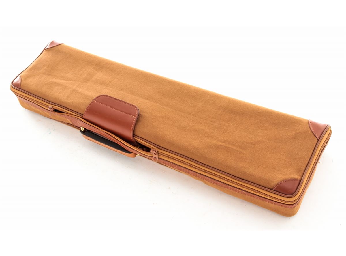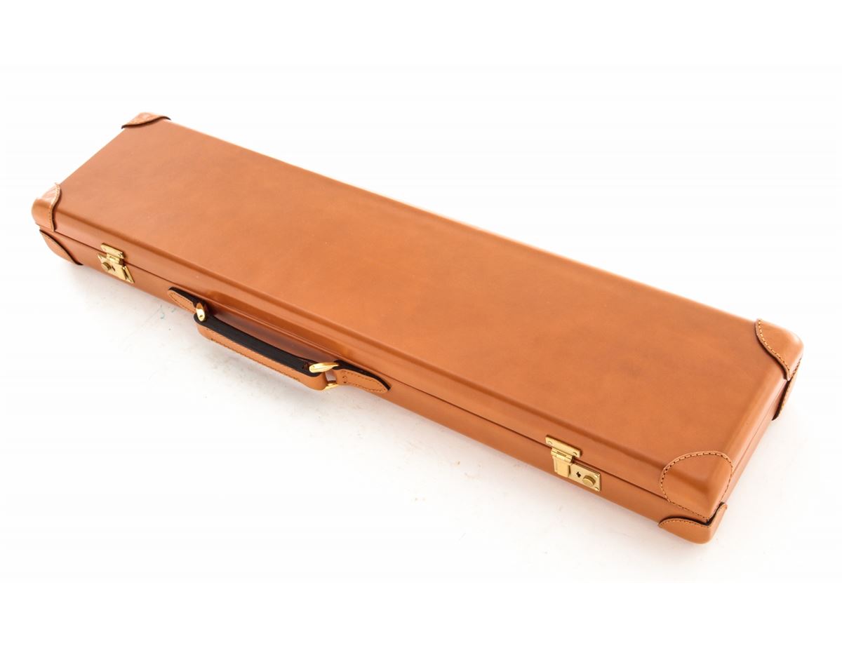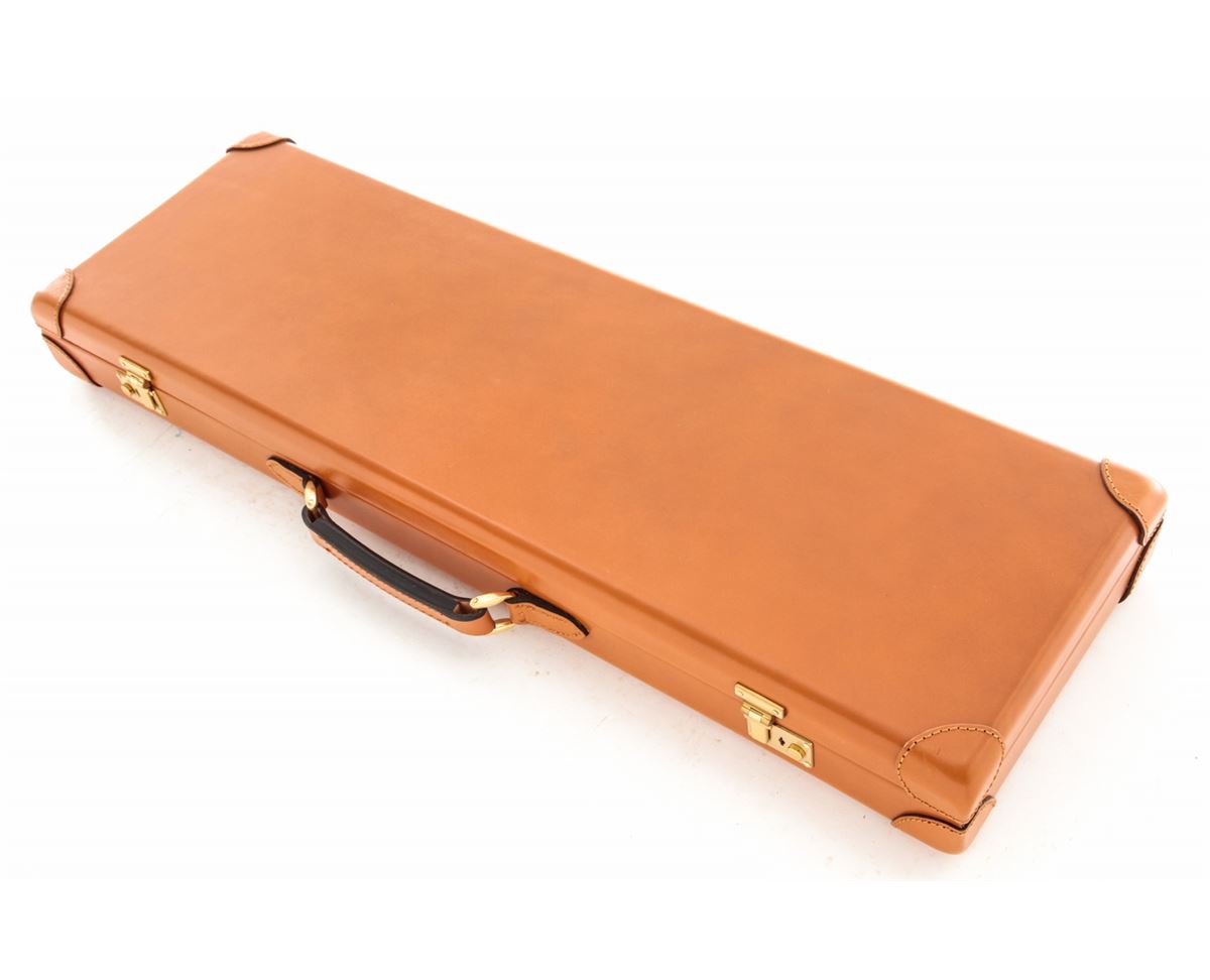 Two Parker Reproduction Emmebi Leather Luggage Cases, including one double case and one single case to each accommodate 20 ga. guns having 28'' barrels, both cases having their original fabric outer covers, Emmebi tags and two keys. Cases appear unused with the double case remaining in its Italian shipping box. Est.: $350-$500/lot.