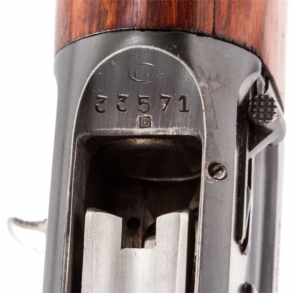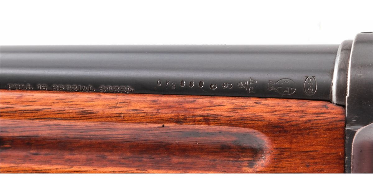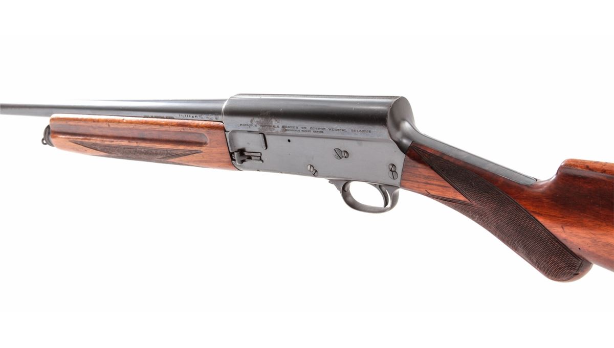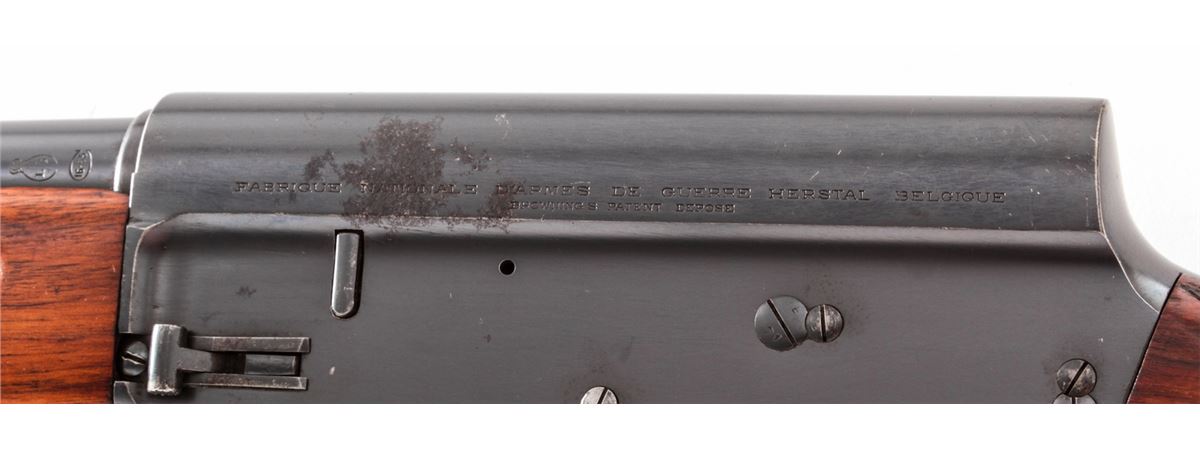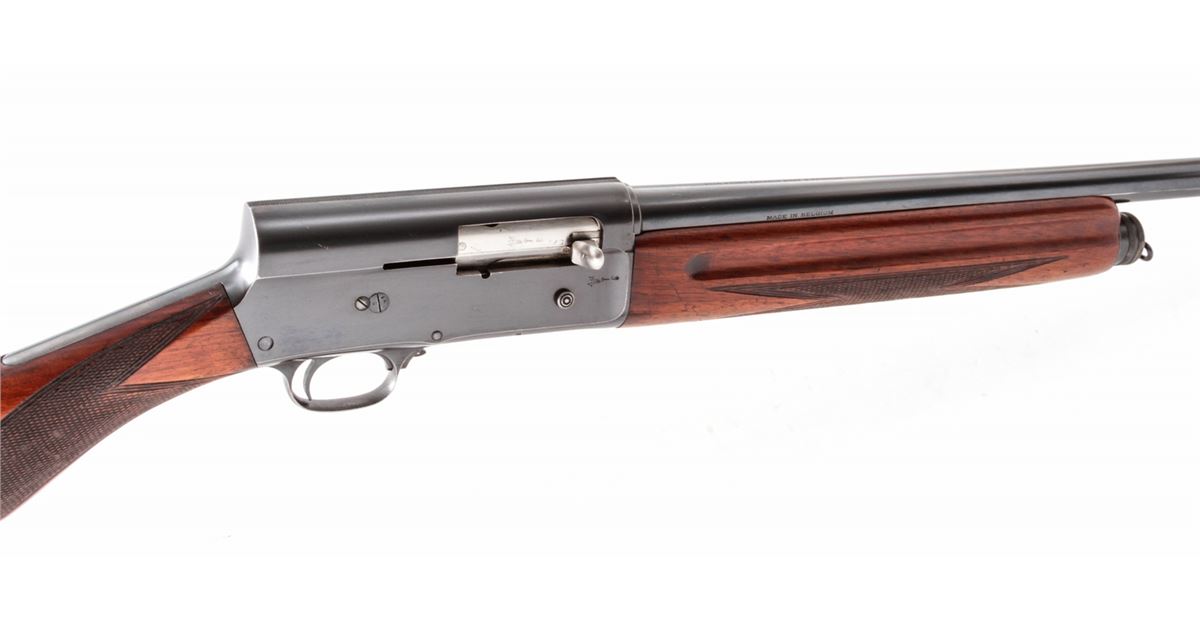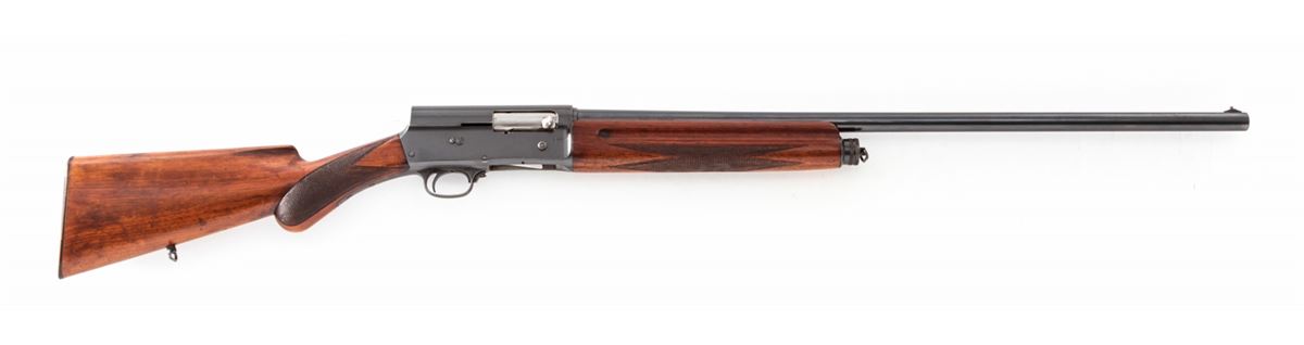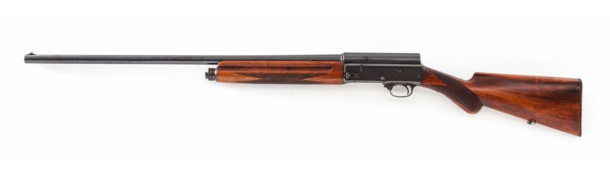 Pre-War FN Browning Auto-5 Semi-Automatic Shotgun, #33571, 16 ga., 27'' round barrel choked Full, blue finish, checkered round knob European walnut stock. Top of barrel marked ''Browning's Arms Co., Ogden, Utah''. Condition is very good to near fine. Metal surfaces retain approx. 90% blue with areas of mild corrosion to left side of frame and midway down barrel. Stock with just moderate flattening to checks, and light scuffs and scratches to wood in general. Good action, bright bore. Est.: $450-$650. (C&R)