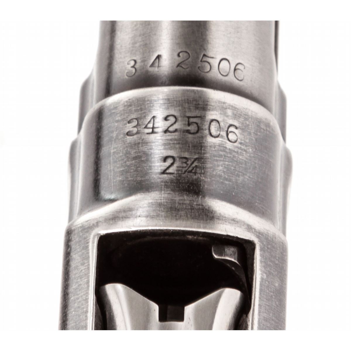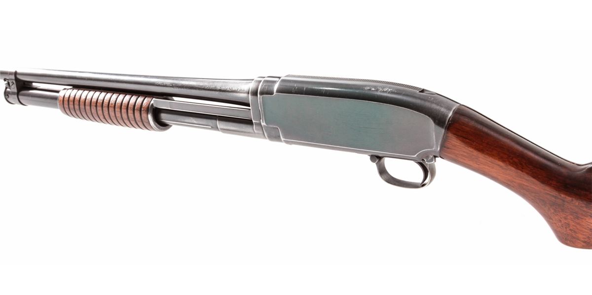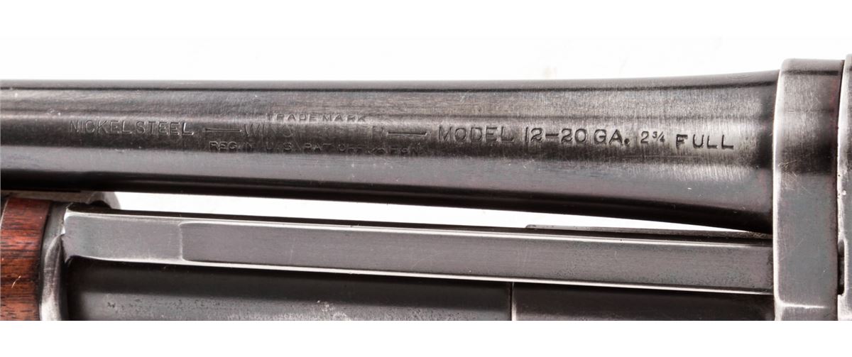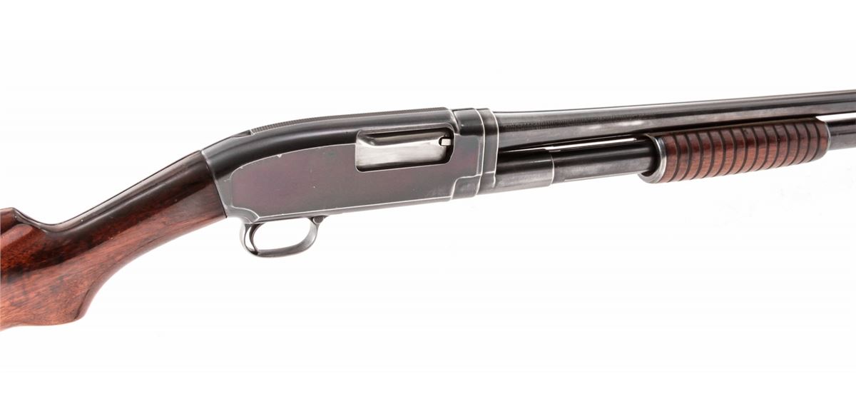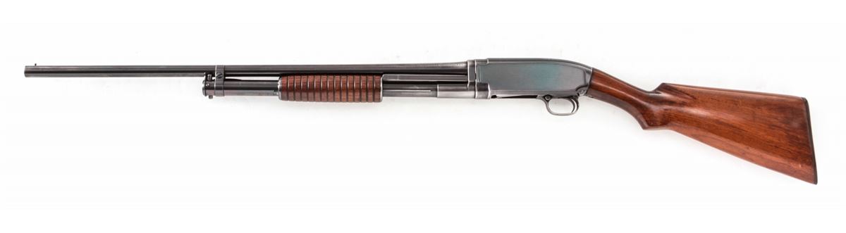 Winchester Model 12 Pump Action Shotgun, #342506, 20 ga., 26'' round barrel choked Full, blue finish, walnut stock, with factory buttplate. Mfg'd 1923. Condition is fine as refinished, retaining approx. 85% blue with most of the losses at balance point and actioning areas. Buttstock with additional coat of varnish; oil darkening near metal contact points. Good action, bright bore. Est.: $350-$500. (C&R)