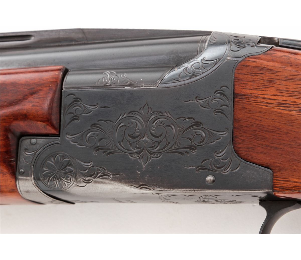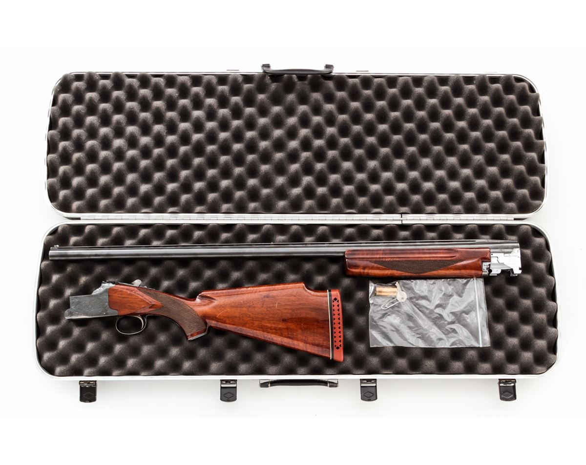 Early Winchester Model 101 Single Barrel Trap Shotgun, #K126672, 12 ga., 2-3/4'' chs., blue finish, 34'' over-single barrel with 5/16'' ventilated matte rib, front and middle white beads, Full choke, single trigger with extractor and manual top tang safety; frame has deeply incised scroll engraving which follows to the triggerguard and forend iron; pistol-grip Monte Carlo stock and fingergroove target forend are plain walnut with a gloss finish. Length of pull is 14-1/4'' over a red 1'' ventilated Winchester recoil pad, checkering is 20 LPI, weight is 8-1/2 lbs. Mfg'd 1969. In black Gun Guard molded case with one key is included. Mechanical condition indicates moderate use with the action just slightly loosening, bores are bright with scattered powder erosion on the face, chamber and extractor, Blue finish is 85% with wear on lower frame, triggerguard and forend latch. Stock finish is 95% with scattered small dents and scratches. Est.: $400-$600. (Modern)