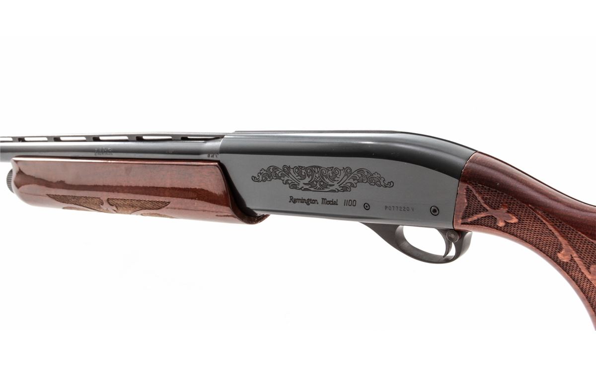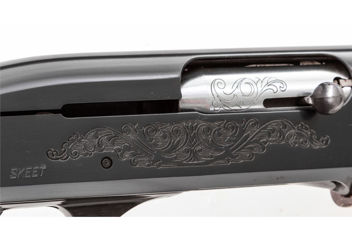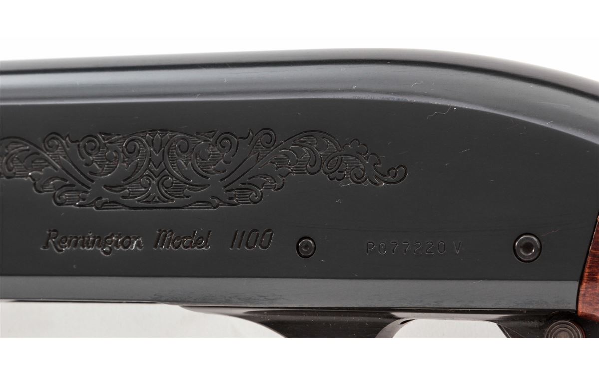 Remington Model 1100 Skeet Semi-Automatic Shotgun, #P077220V, 12 ga., 25'' vent rib barrel choked Skeet for 2-3/4'' shells, blue finish, pressed checkered walnut stock. Right side of frame marked ''Skeet''. Condition is excellent showing little use. Est.: $300-$500. (Modern)