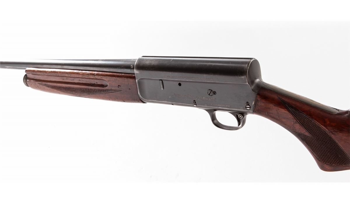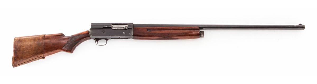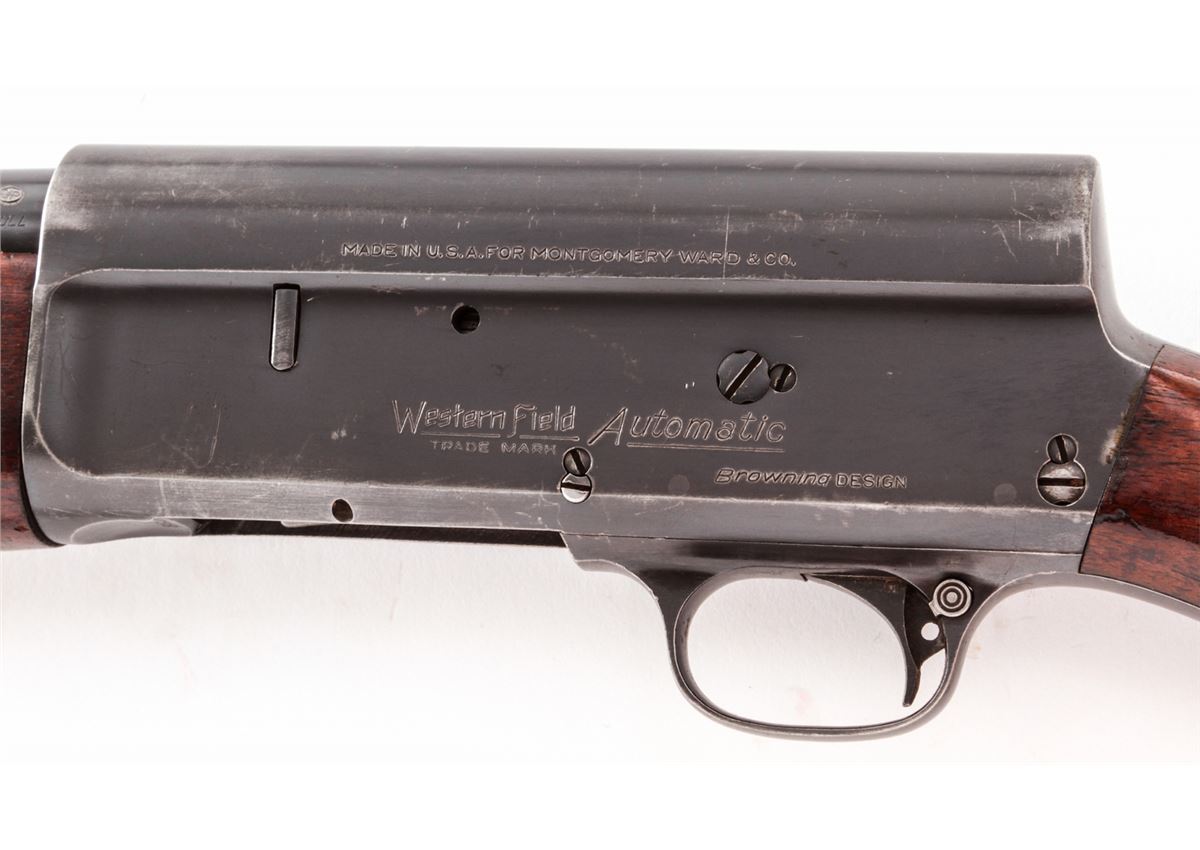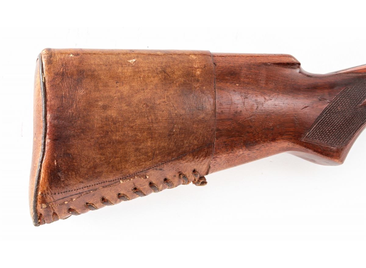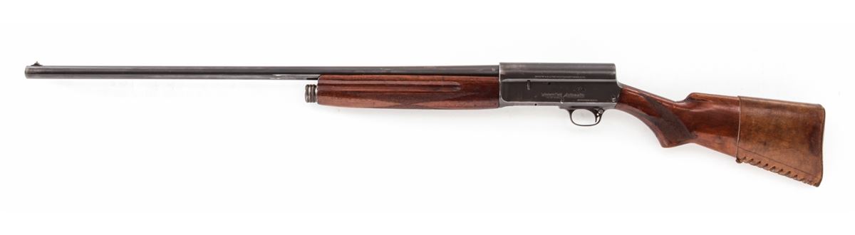 Westernfield Semi-Automatic Shotgun (Remington Model 11), #8815, 12 ga., 30'' round barrel choked Full, blue finish, checkered walnut stock and forend, with leather butt cover. Condition is fine retaining approx. 85% blue. Stock with repairs at upper tang and additional coat of varnish. Crisp action, fine bore. Est.: $200-$400. (C&R)