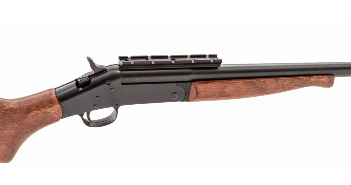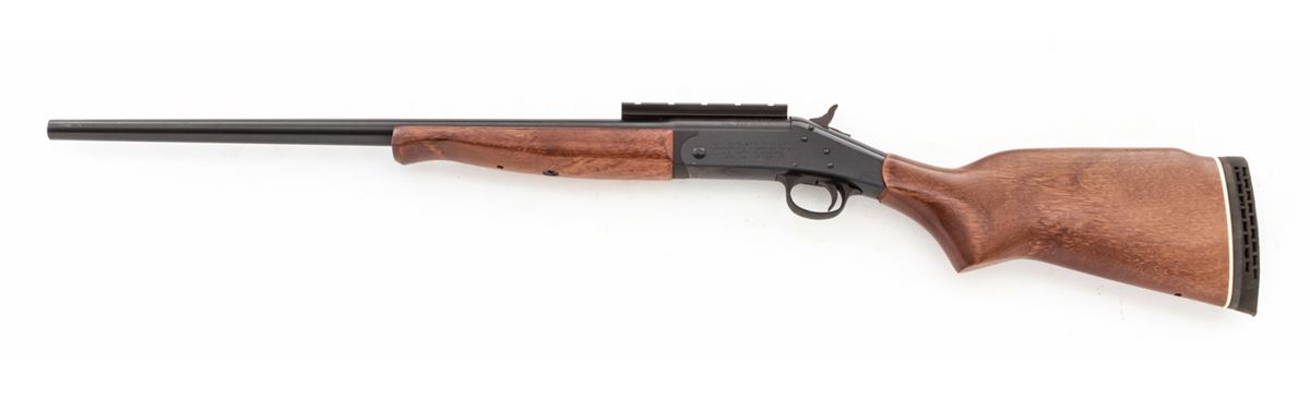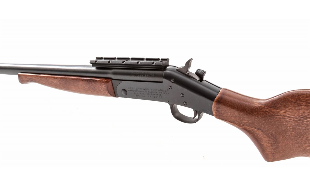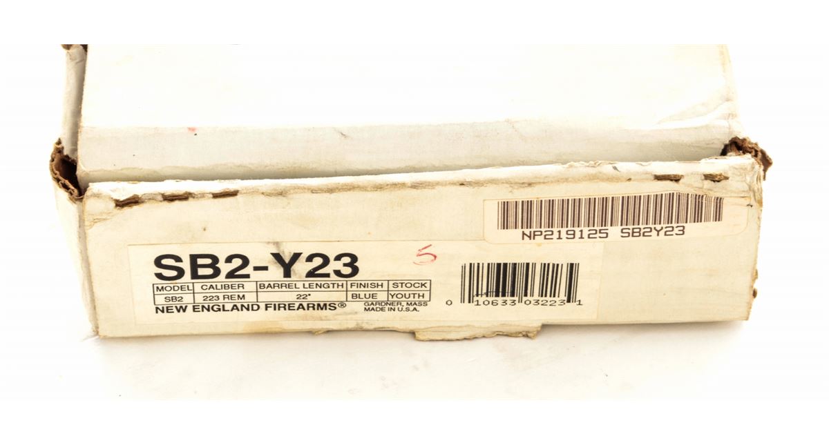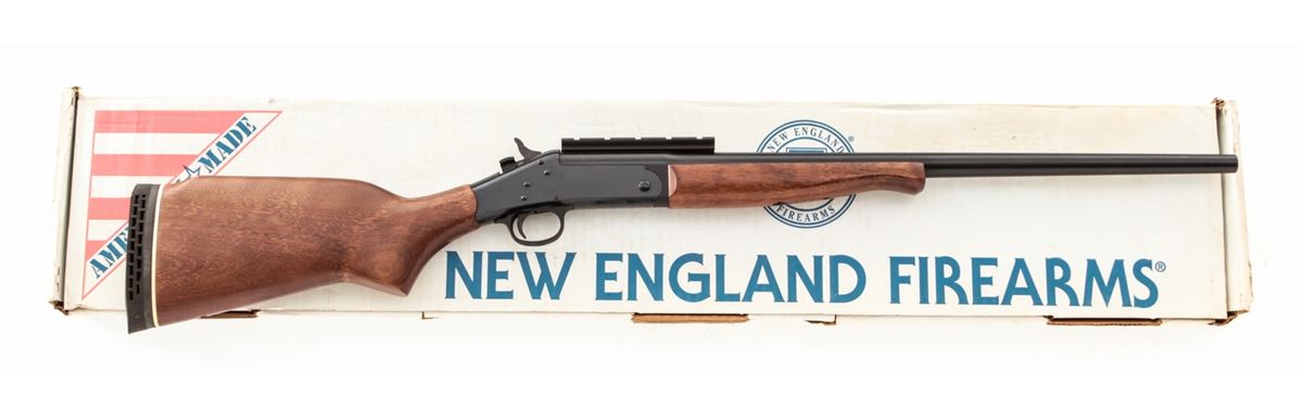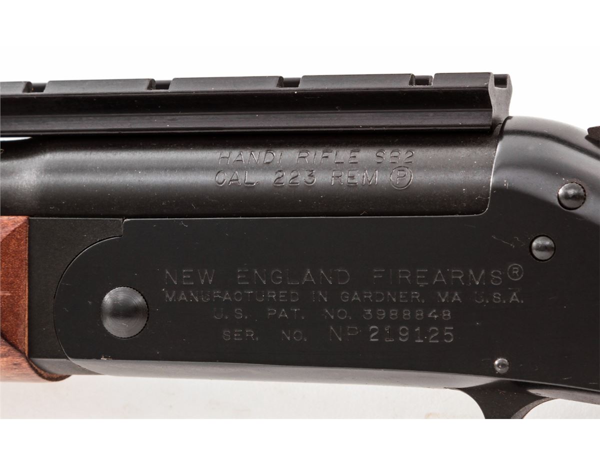 New England Firearms Handi Single Shot Rifle SB2, #NP219125, .223 cal., 22'' barrel, blue finish, birch stock, with Weaver rail to top of barrel assembly. Condition is excellent, appearing as new, in original box. Est.: $200-$400. (Modern)