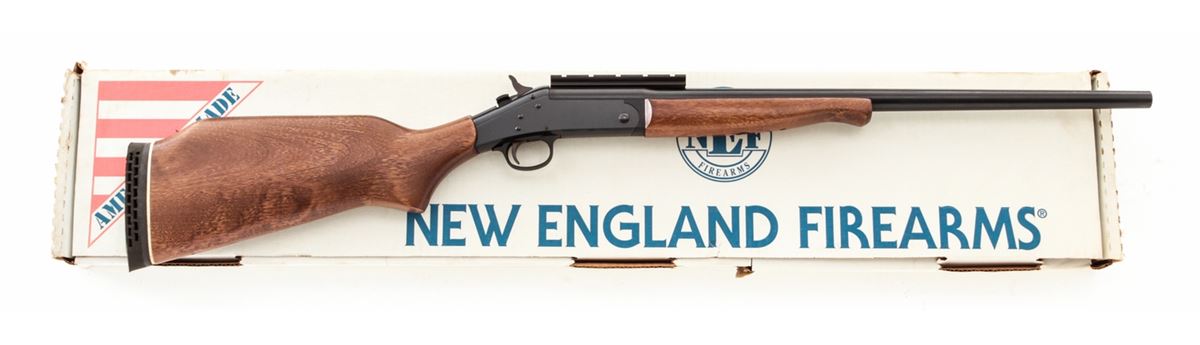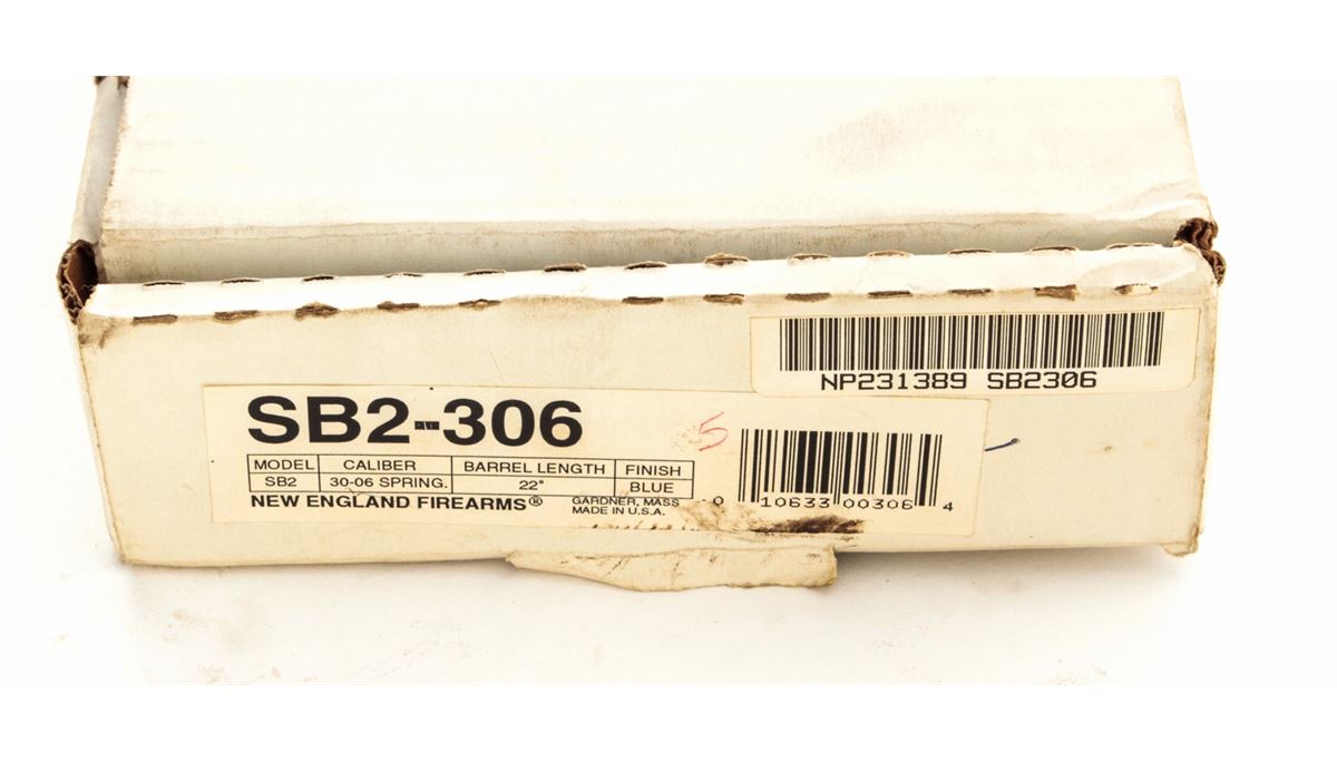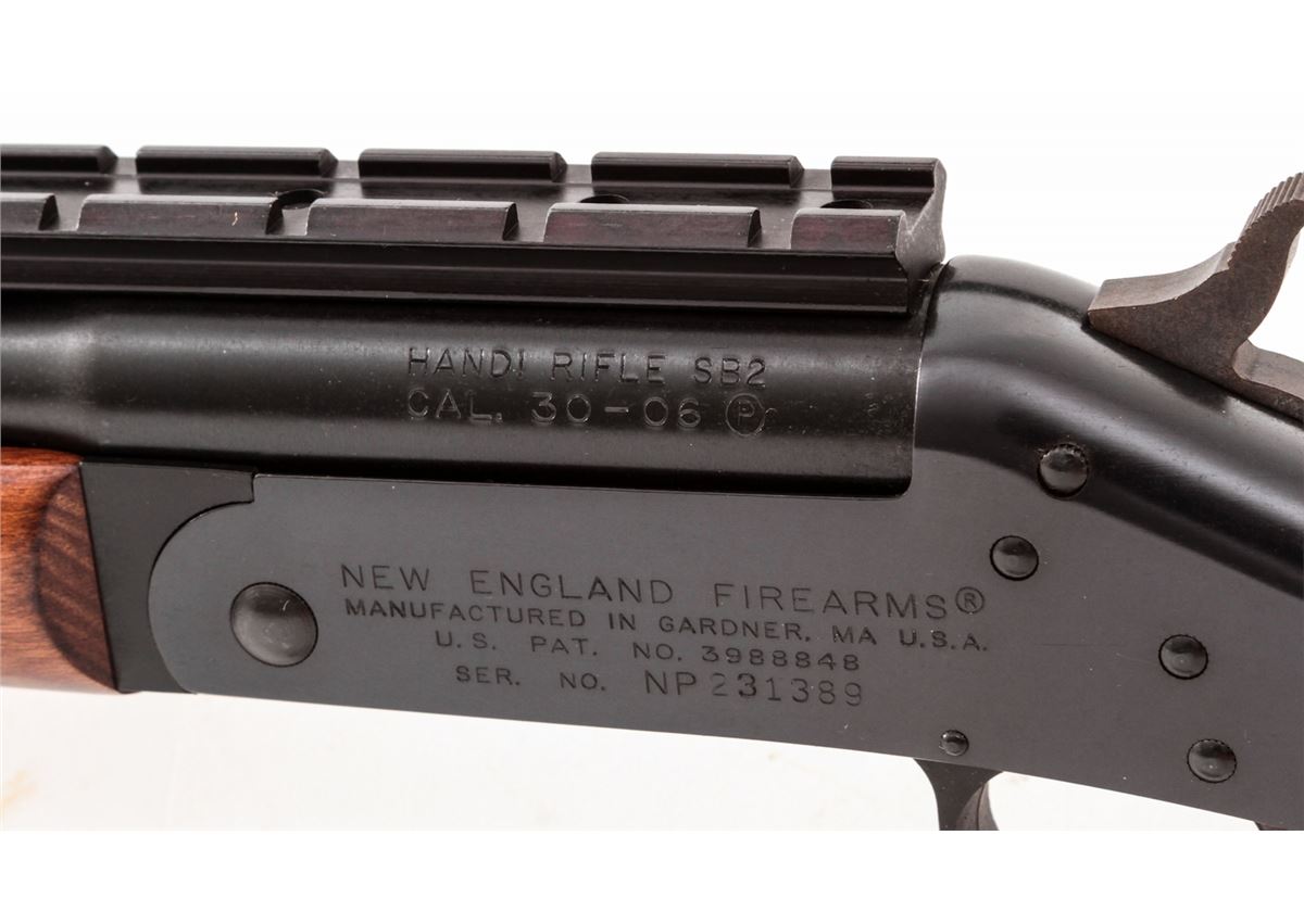 New England Firearms Handi Single Shot Rifle SB2, #NP231389, .30-06 cal., 22'' barrel, blue finish, birch stock, with Weaver rail to top of barrel assembly. Condition is excellent, appearing as new, in original box. Est.: $200-$400. (Modern)