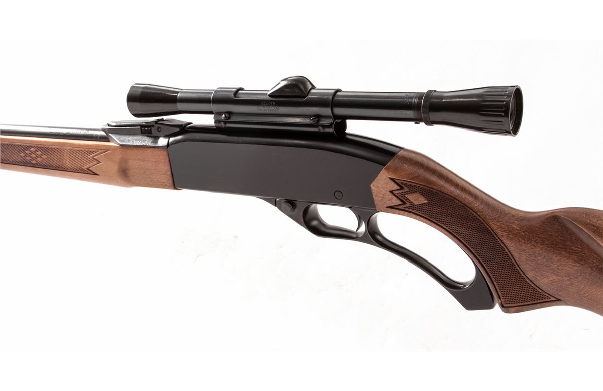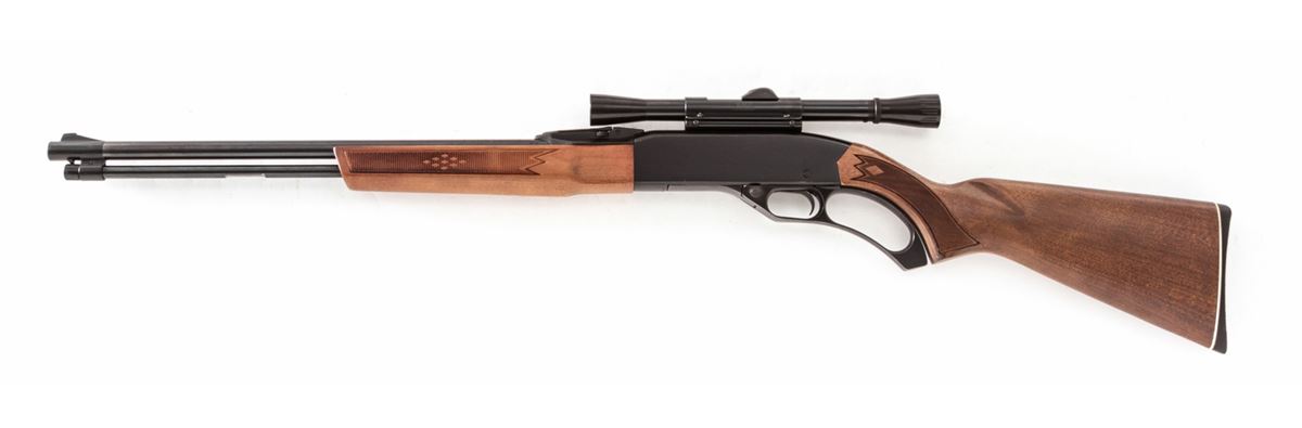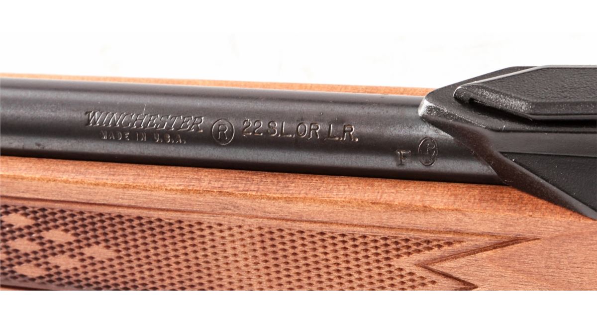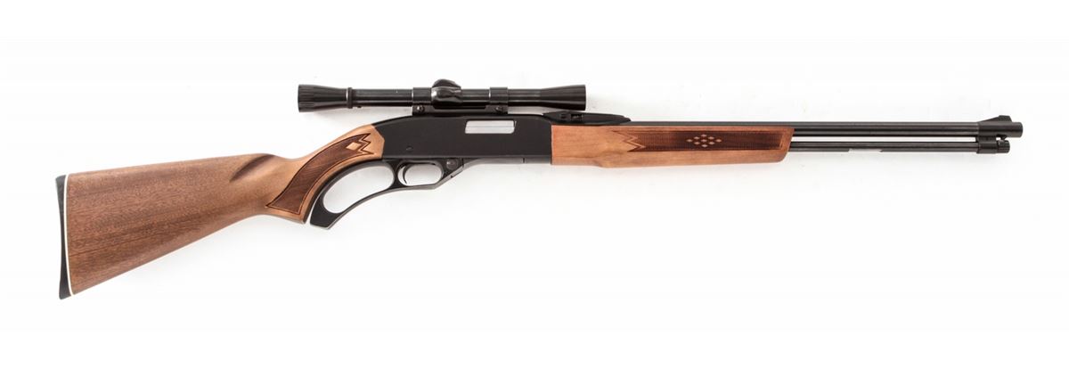 Winchester Model 250 Lever Action Rifle, #708428, .22 LR cal., 20'' barrel, blue finish, pressed checkered birch stock, with Weaver scope. Condition is fine with light overall scuffs to metal frame. Good wood, action and bore. Scope optics are clear. Est.: $125-$250. (Modern)