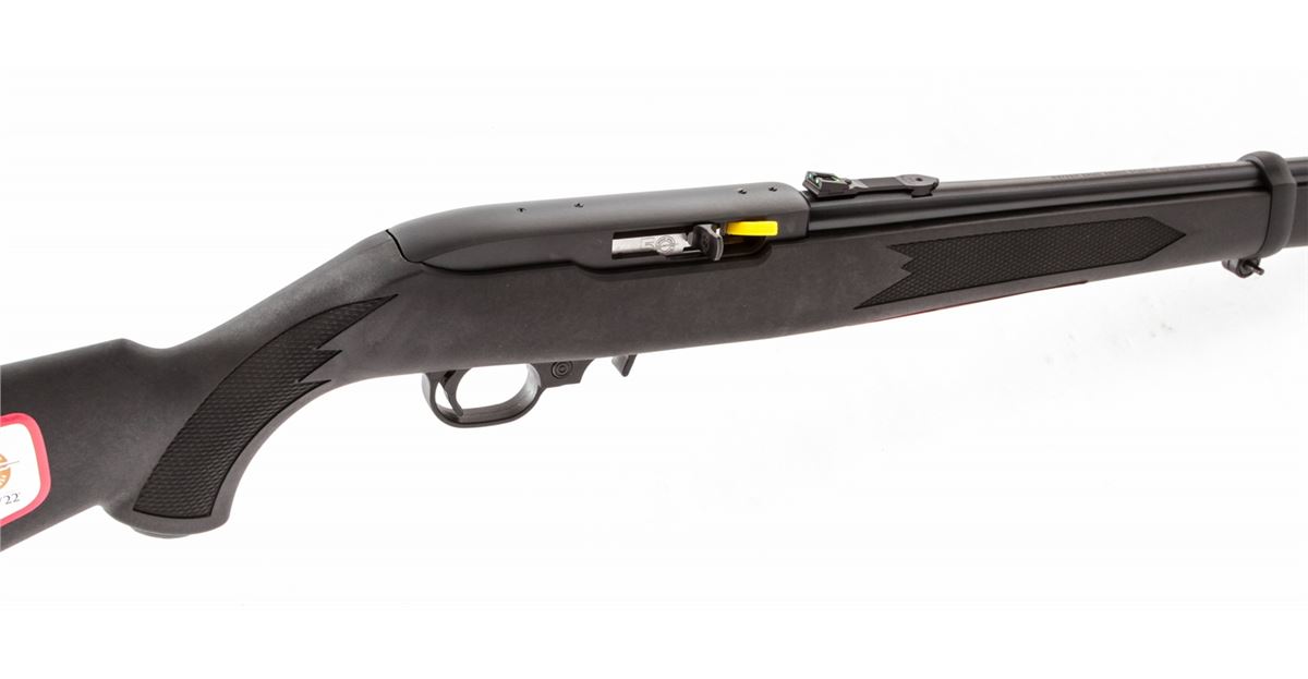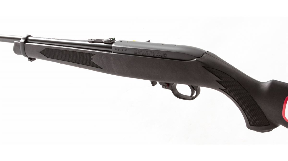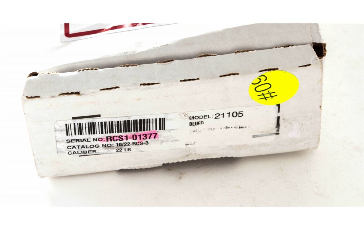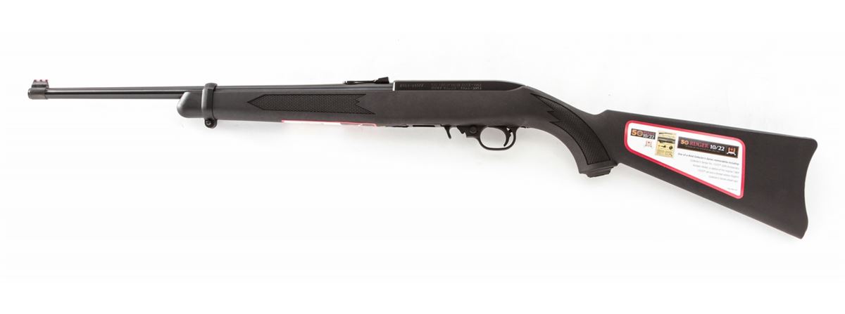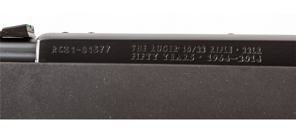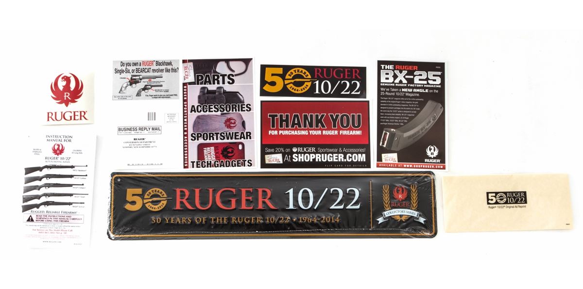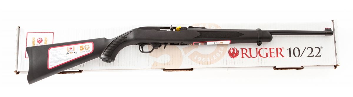 Ruger 10/22 50th Anniversary Semi-Automatic Carbine, #RCS1-01377, .22 LR cal., 19'' barrel, blue finish, Ruger synthetic stock, with fiber optic sights, two (2) 10-round magazines, metal sign, and Ruger 10/22 sticker, in original box with paperwork. Condition is excellent, appearing as new and unfired. Est.: $200-$400. (Modern)