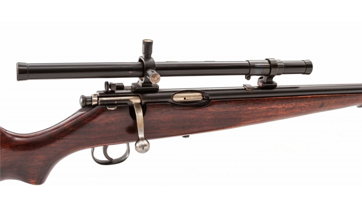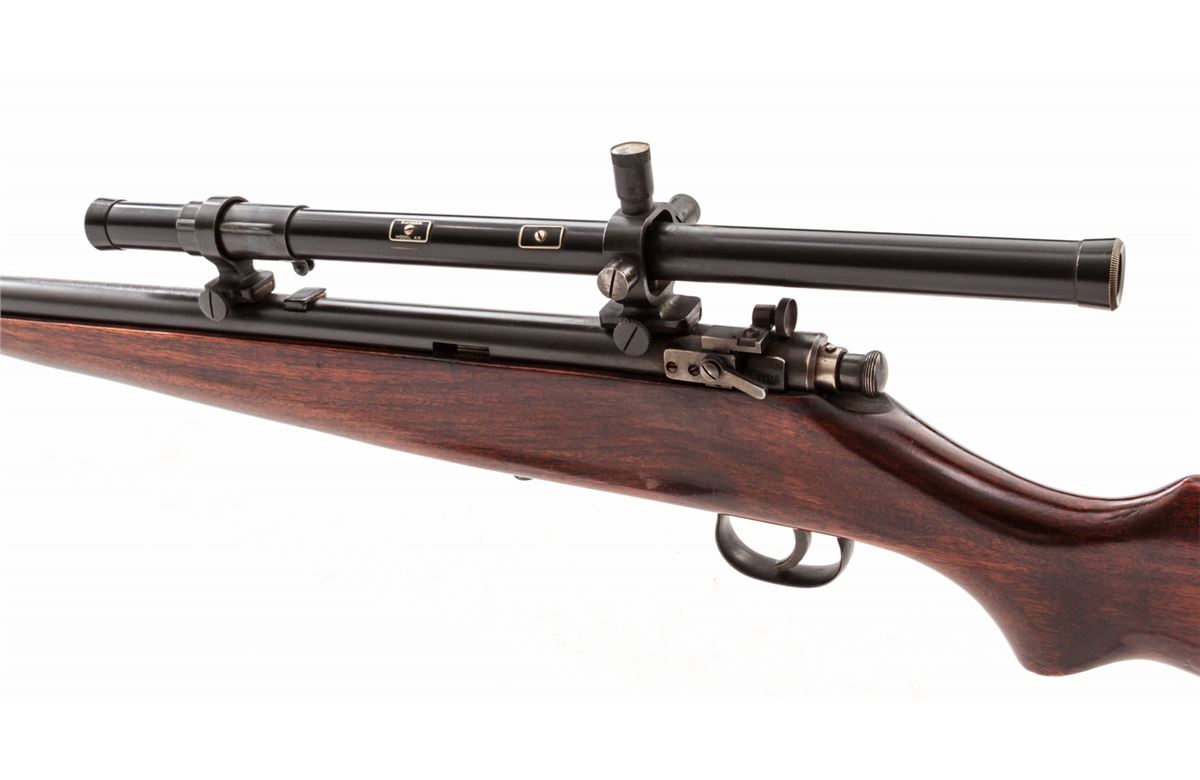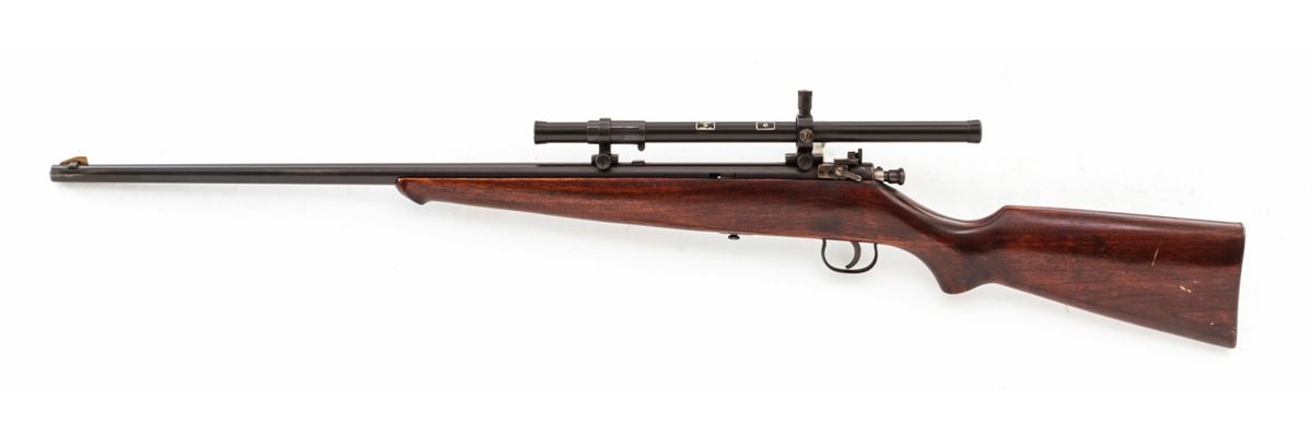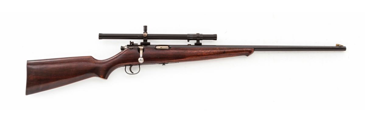 Savage Sporter Bolt Action Rifle, #42533, .22 LR cal., 23'' barrel, blue finish, walnut stock, with early Ranger 4x scope, receiver peep sight, and Rocky Mountain nickel silver front blade. Condition is near excellent. Rifle has toned slightly but still retains approx. 94% blue. Stock with some added finish. Crisp action, bright bore, and one original magazine. Pre-war scope optics are clear. Est.: $200-$400. (C&R)