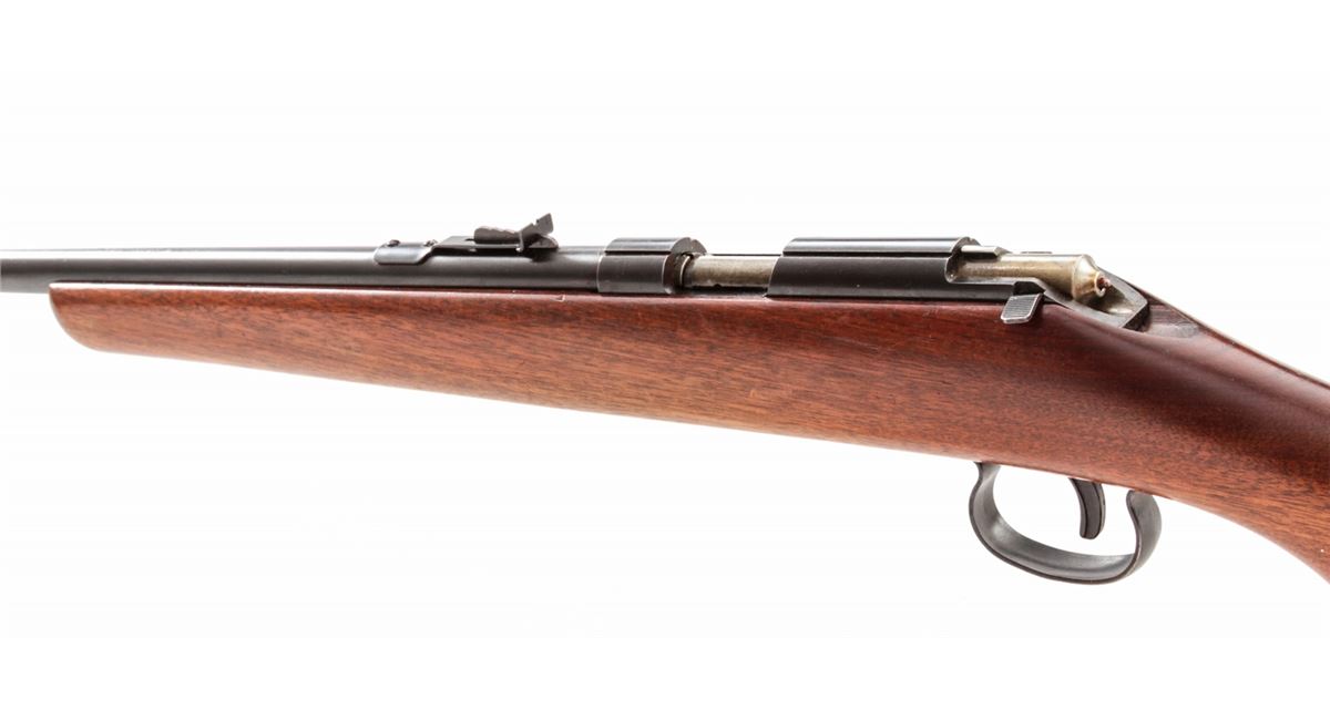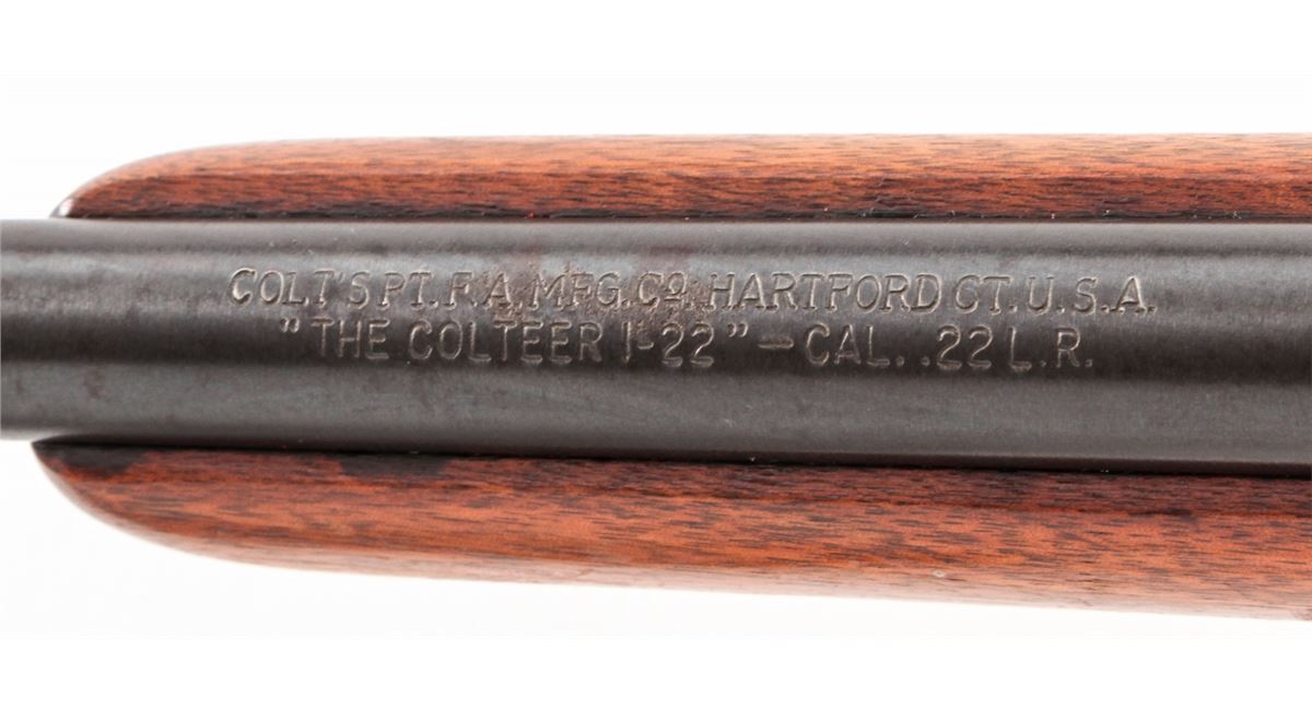 ''The Colteer'' I-22 Single Shot Rifle, NVSN, .22 LR cal., 24'' barrel, blue finish, walnut stock, with Colt marked black plastic buttplate. Condition is fine. Metal surfaces show approx. 92% original blue. Stock with minor impressions. Good action and bore. Est.: $200-$400. (C&R)