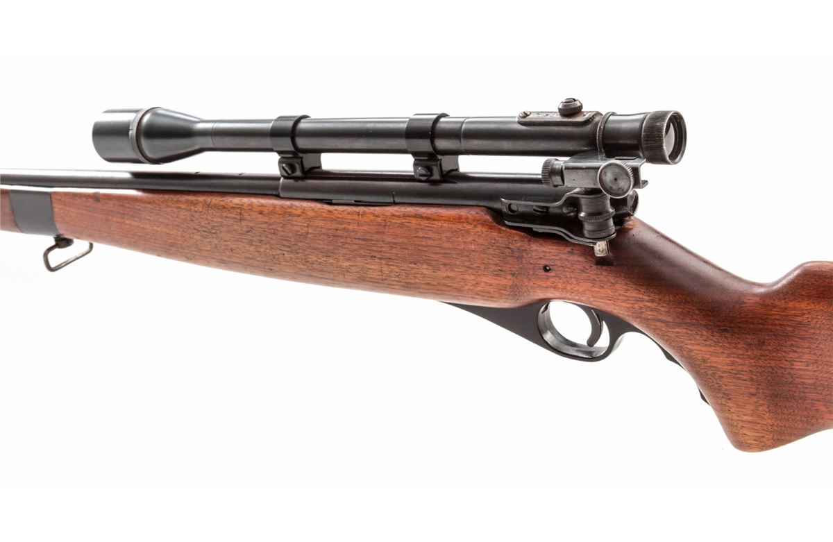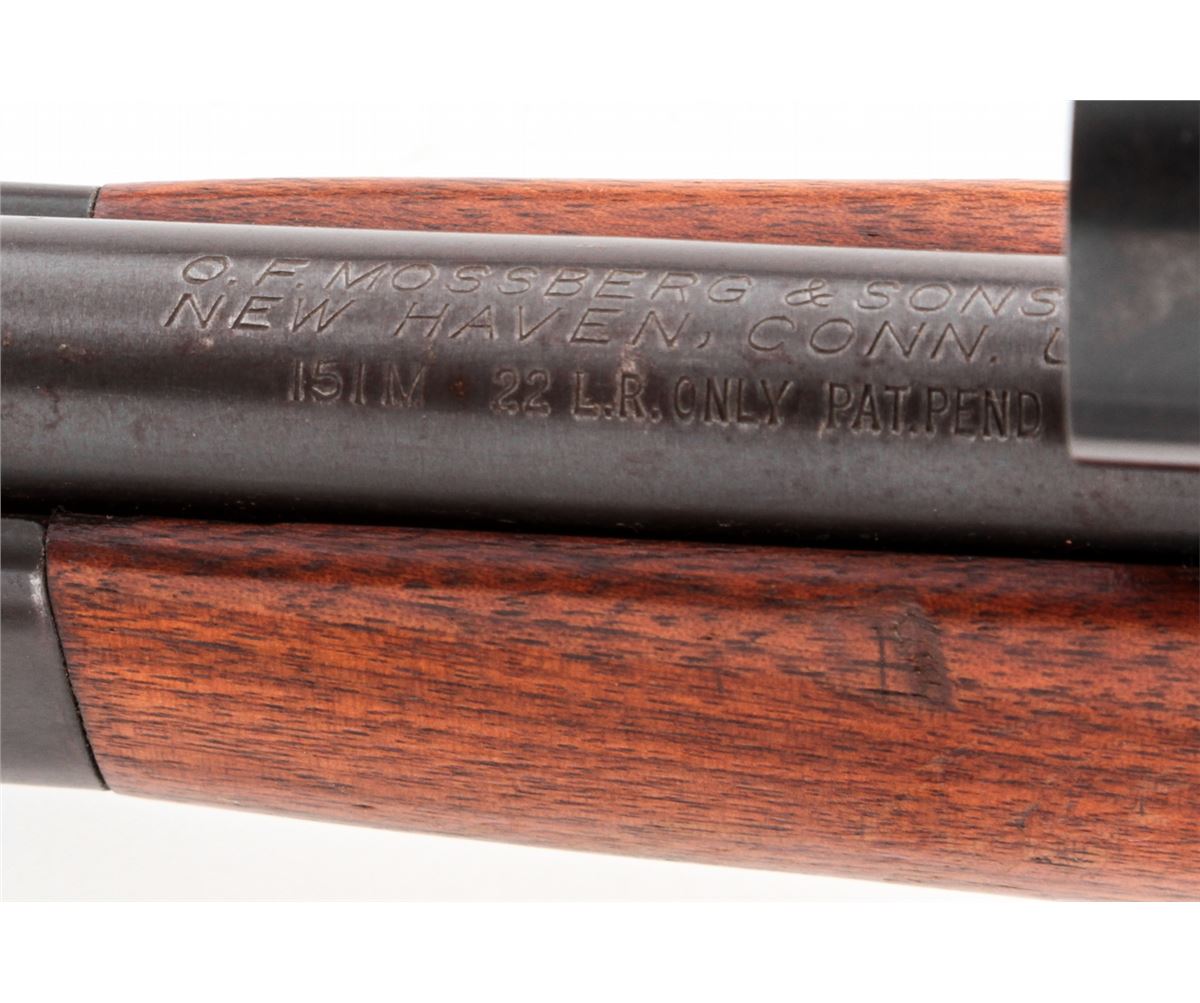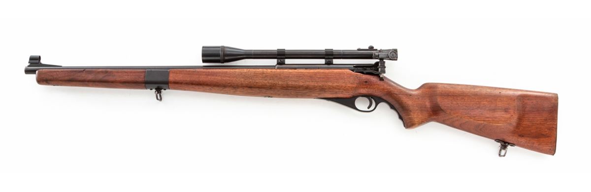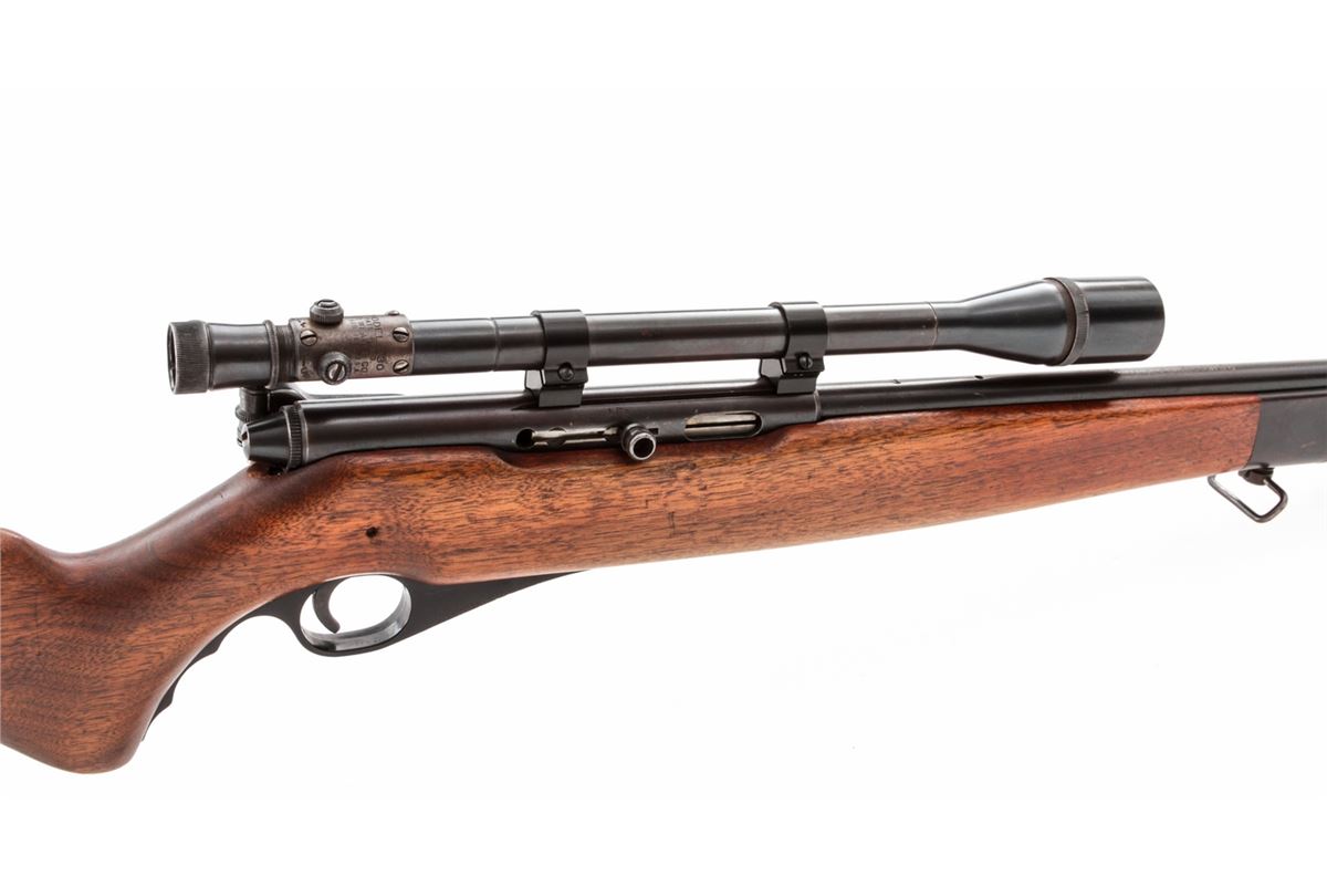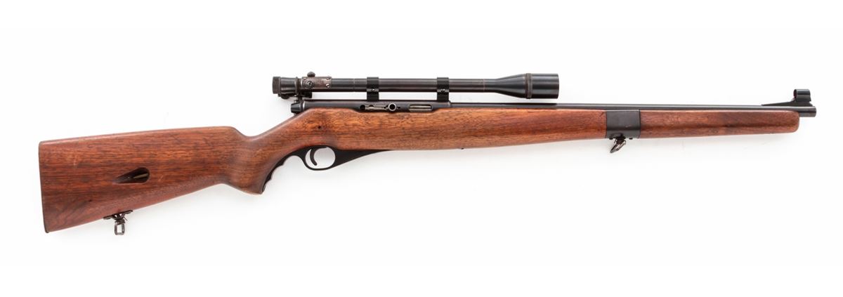 Mossberg Model 151M Semi-Automatic Rifle, NVSN, .22 LR cal., 20'' barrel, blue finish, walnut stock, Mossberg peep sight and Weaver 330 scope. Condition is about fine retaining approx. 90% thinning blue. Stock with light scuffs and scratches. Good action and bore. Scope optics are clear. Est,: $150-$300. (C&R)