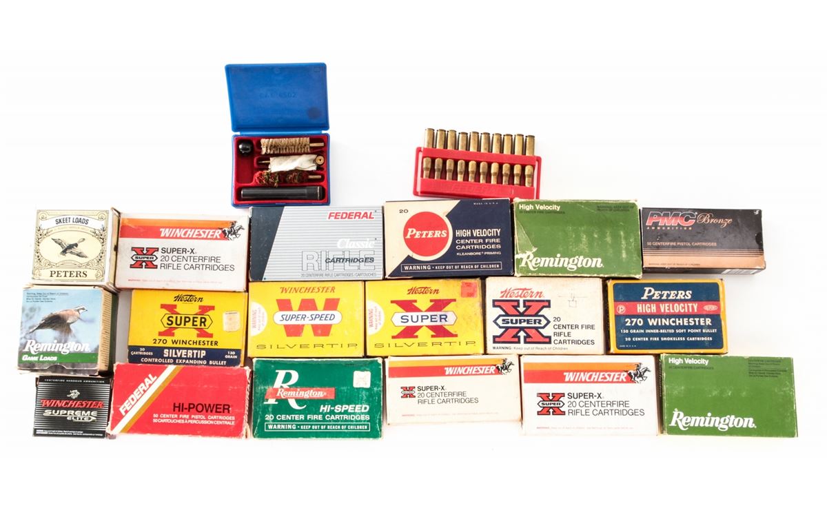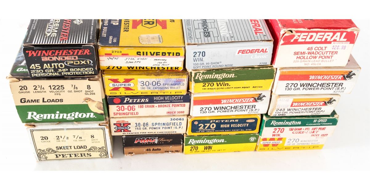 Misc. Lot of Ammunition, consisting of approx. eighteen (18) boxes of mostly rifle ammo. Most boxes are full, some partial, in .270 Win., .30-06, .243, .45 Colt, .45 Auto, and two boxes of 20 ga. shotgun shells. All are in good condition, ca. 1960s-1990s vintage. Est.: $200-$400/lot.