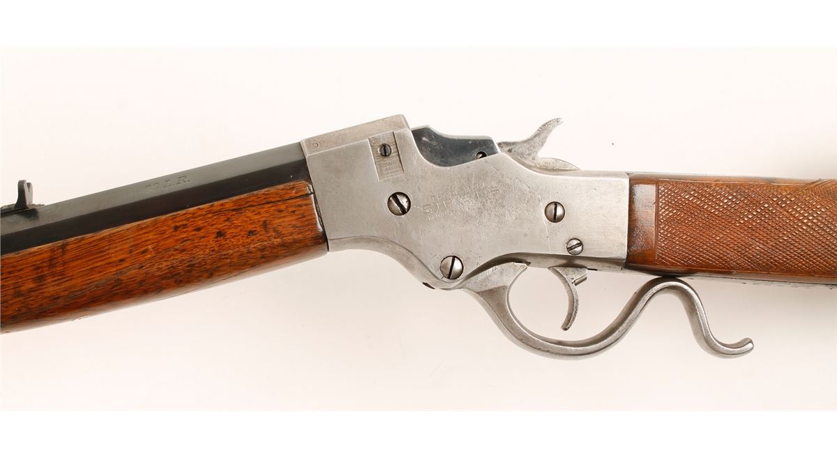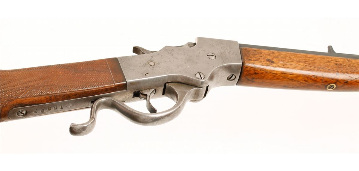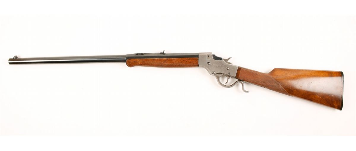 Single-shot drop-block lever operated rifle with a 23-1/4" half-round, half-octagon bull barrel and wood furniture. Blued barrel is number 65730 and is stamped Stevens. The muzzle has a recessed flat crown. Bluing is in good condition with a few scrapes and edge wear. Receiver, lever, hammer and trigger are worn to in-the-white state with light pin prick pitting and rust stains. Plastic or hard rubber butt plate has a few marks. Wood butt stock has rough checkering with some rubs, dings, scrapes and scratches. Schnabel forend has cracks at the tip and the receiver with numerous scratches and scrapes. Bore is mirror bright with sharp rifling. Action is tight and smooth. Condition is good.