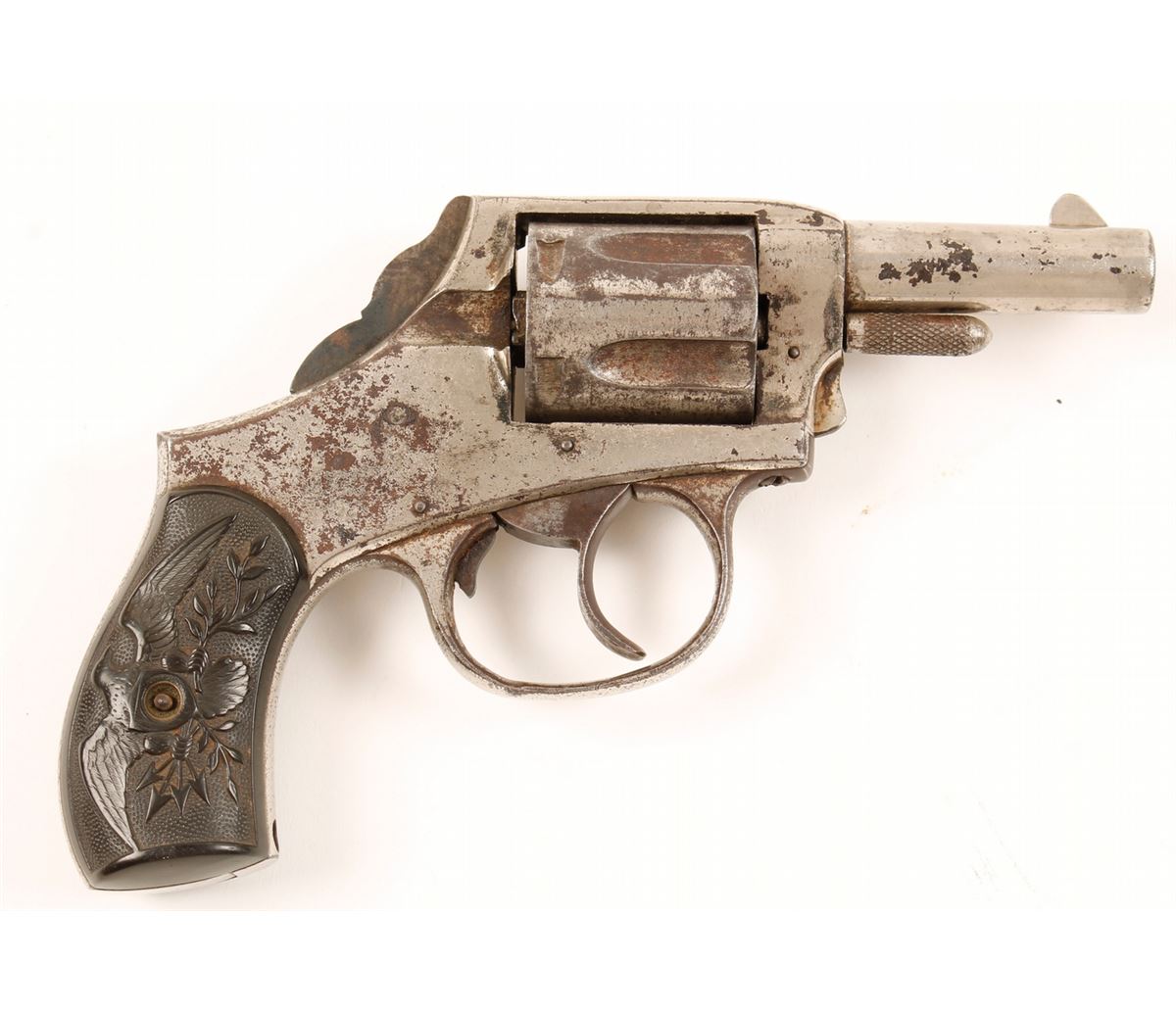 Plated double-action 5-shot revolver with a spurless hammer, hard rubber grips and a 2-1/2" barrel. "American Bulldog" is stamped on the topstrap. Plating is worn and much of it is gone showing patinated steel. Bore is dark with moderate pitting and sharp rifling. Chambers are dull with possible light pitting. Action works well but lock-up is very loose. Grips have some wear causing loss of details on the high spots but are in overall very good condition. Condition is fair.