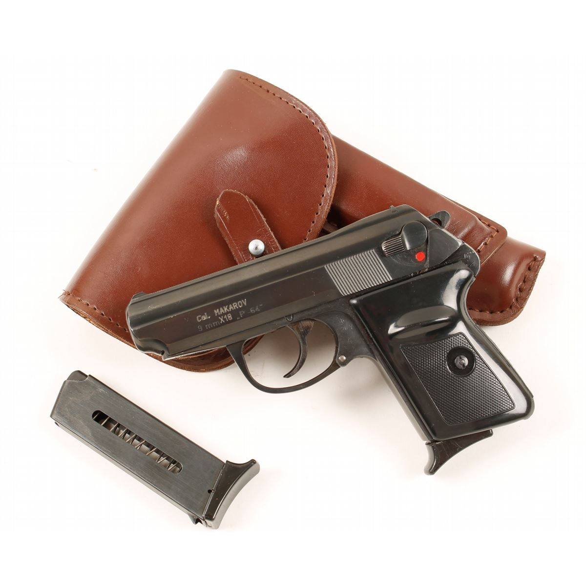 Blued double-action semi-automatic pistol with a 3-1/4" barrel, holster and 2 finger rest magazines. Made in Poland. All steel finish is in very good condition with only a few tiny marks. Bore is mirror bright with strong rifling. Plastic grips are in good shape with only tiny scratches, dings and rubs. Action works well with safety acting as decocker. Has a tactile loaded chamber indicator. Leather holster appears to be new with a pocket for the spare mag. Condition is excellent.