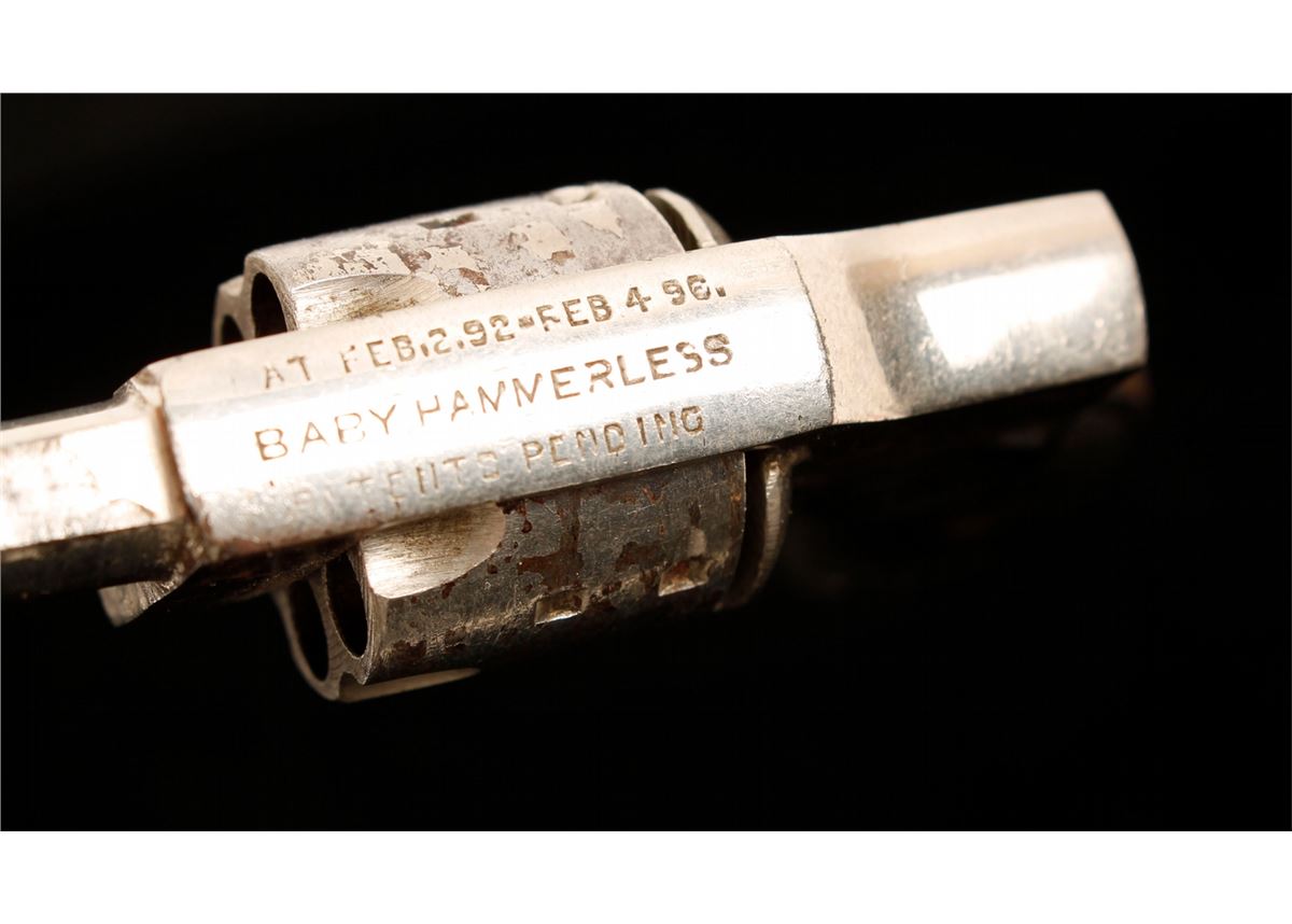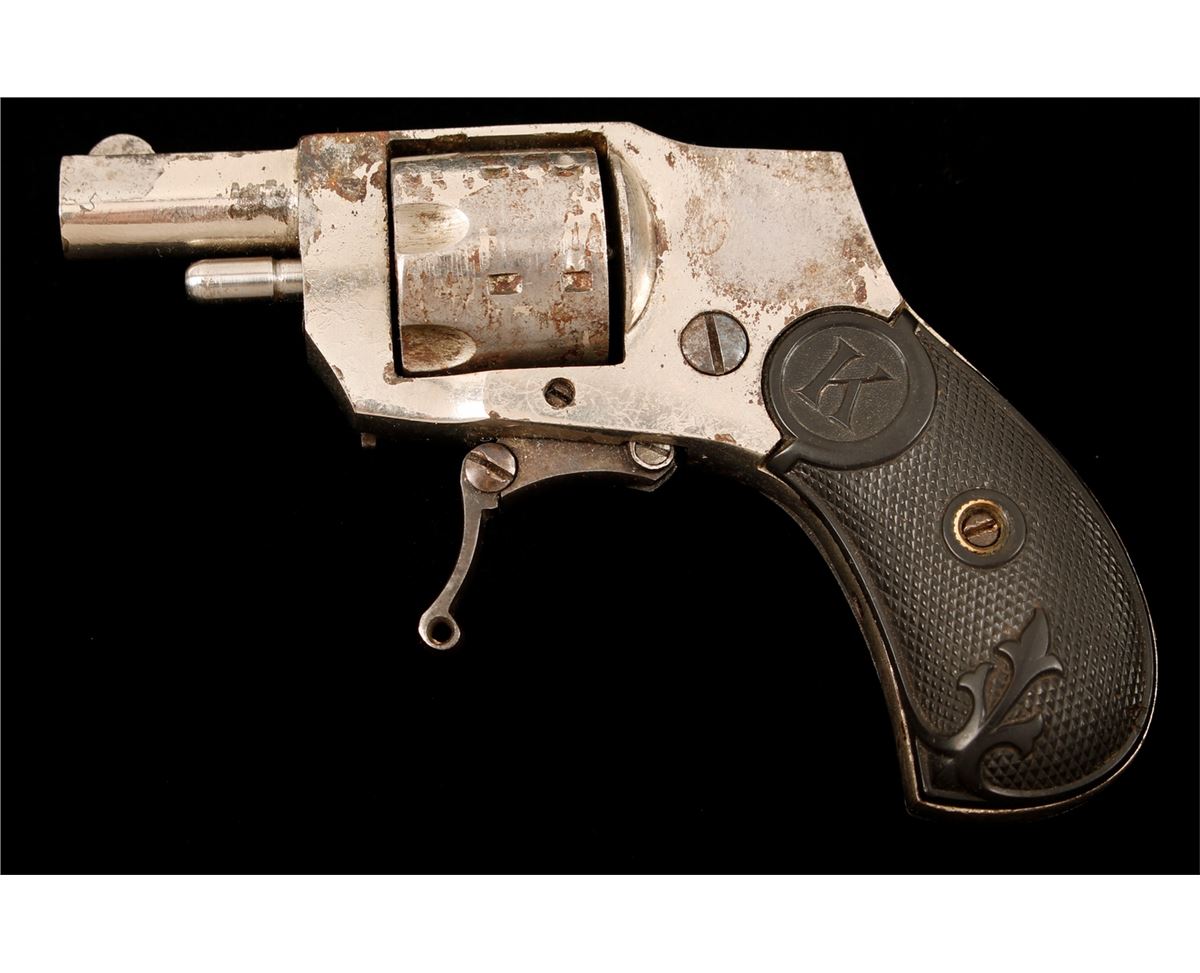 Plated folding-trigger hammerless 6-shot revolver with a 1-1/4" barrel and hard rubber grips. Plating is scratched, crazed, flaking and worn to bare metal on much of this revolver. Bore has moderate pitting with visible rifling. Chambers show light pitting. Hard rubber grips are in very fine condition and have a "K" in them for Kolb (the maker). Action is a little stiff but it works with loose lock-up. Condition is fair to good.