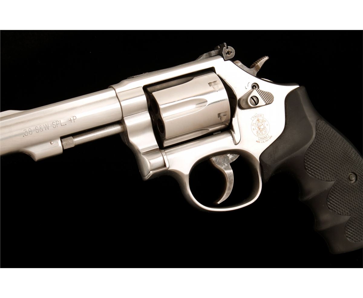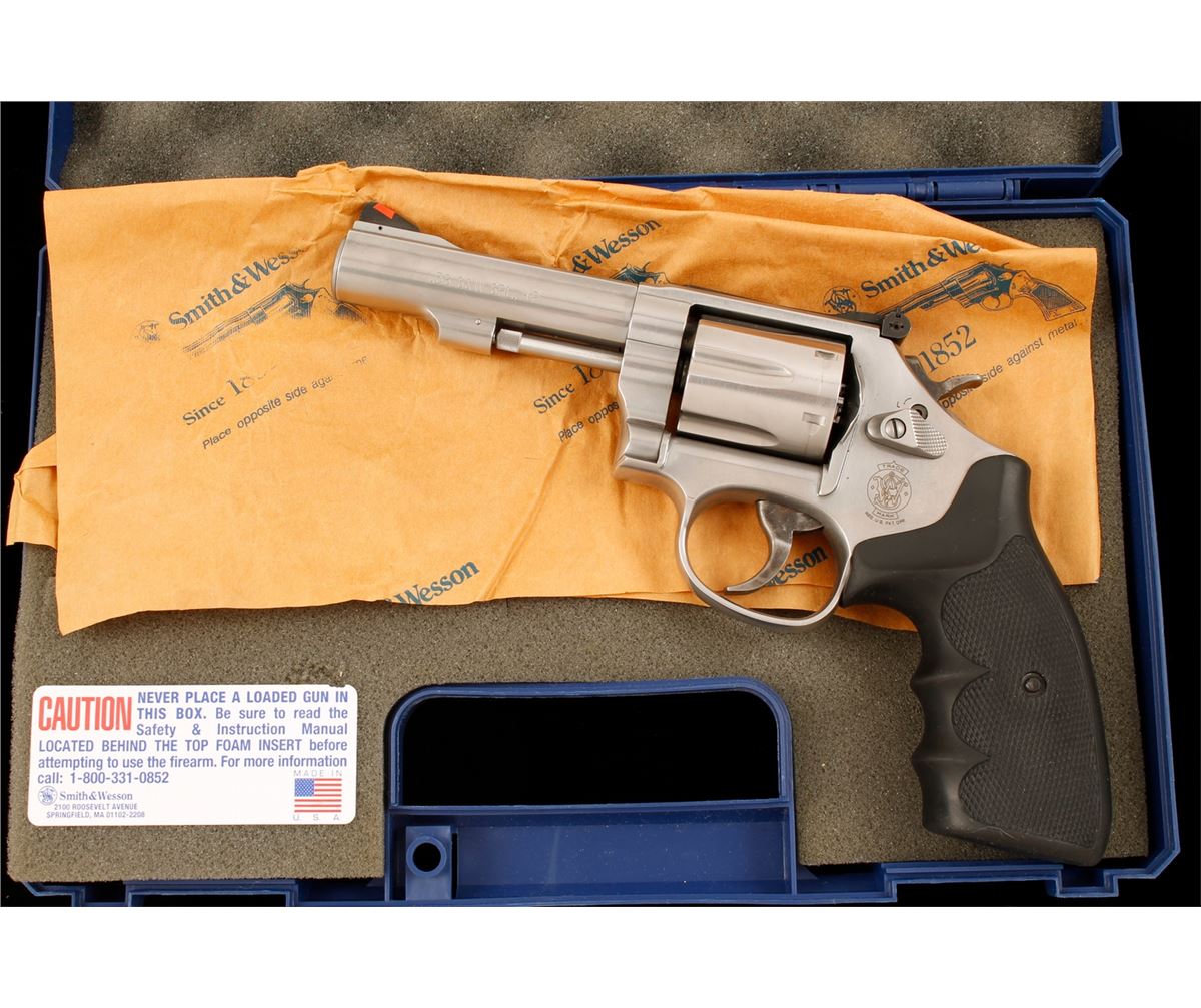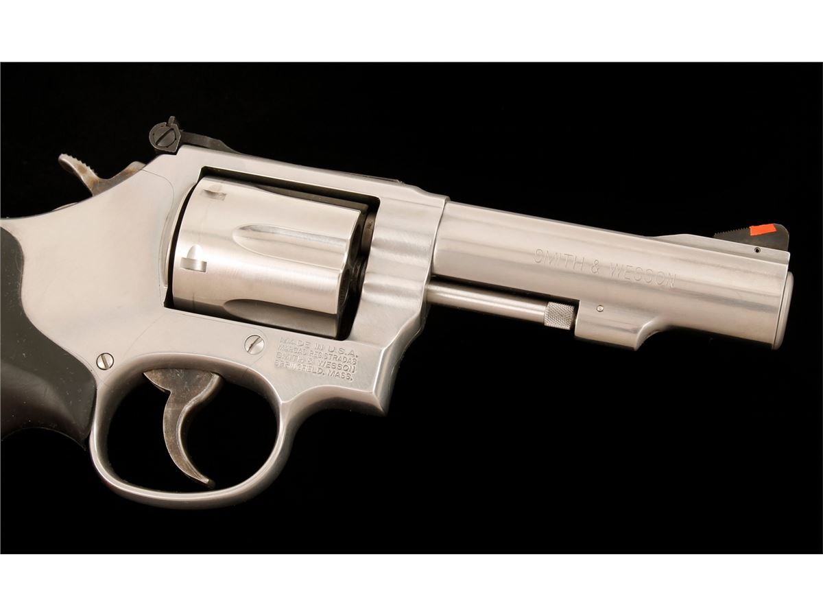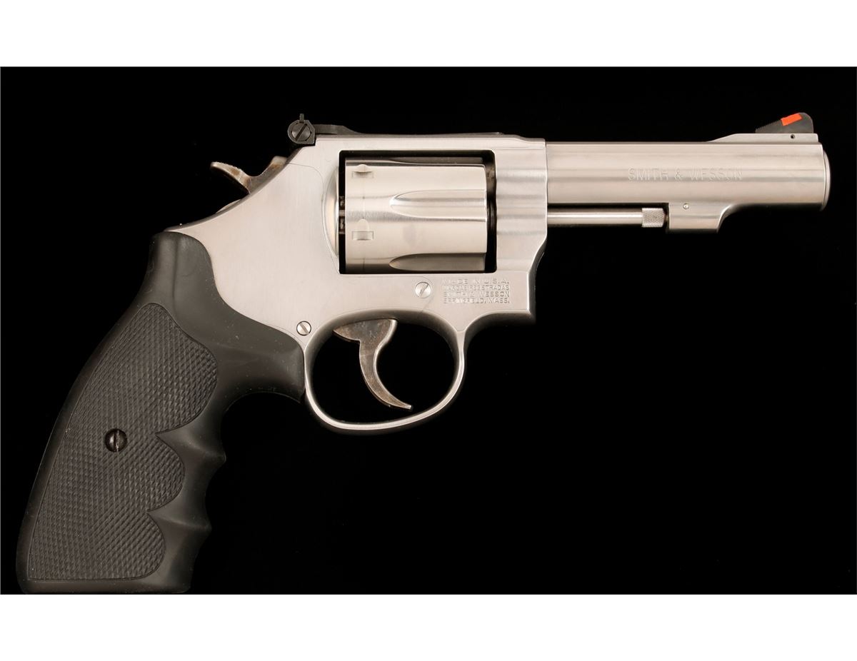 Stainless steel double-action 6-shot revolver with a 4" barrel, rubber finger-groove grips, cloth sleeve and factory box. Metal finish is good with only a bright drag line. bore is mirror bright with strong rifling. Chambers are bright and shiny. Grips have some scratches in the rubber. Action is smooth with good lock-up. Includes manual, cable lock with keys and keys for the integral action lock. Condition is very good.