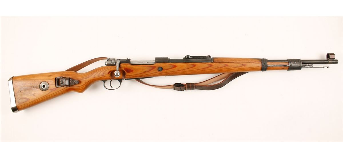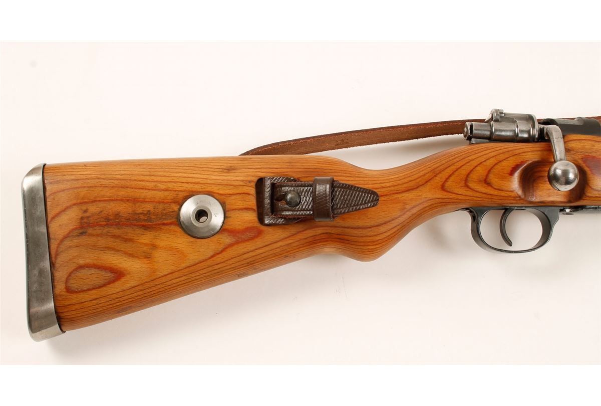 Mitchell's Mausers rifle. Blued bolt-action refinished Russian capture rifle with a 24" barrel, wood stock, and leather sling. All visible numbers match except the forend cap, rear sight and base and buttplate. Metal finish on barrel and receiver is splotchy with refinish over pitting. Floorplate is brighter and bolt is bright and in-the-white. Receiver ring is marked with "dou 43" and the Russian cross. Made at Waffen-Werke Brunn in 1943. Laminated wood stock is refinished and has been recently stamped with the receiver serial number. There were some stamps on the right side of the butt that seem to be waffenamts. One seems to be a waffenamt over an "H". Bore is dull with strong rifling. Action works well. Leather sling has a waffenamt. Includes Mitchell's box and documents. Condition is good.