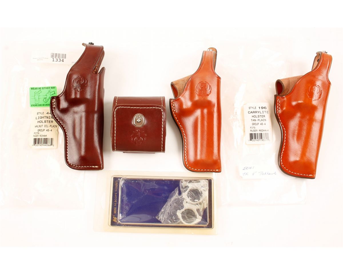 All holsters are leather and for a Ruger Redhawk (4" barrel) with Ruger emblem pressed into them. Also a folding leather cartridge carrier with a lift-the-dot closer and spaces for 10 cartridges. It also has the Ruger emblem pressed into it. A pair of non-ferrous scope rings (for a Weaver or picatinney rail mount) in a NcStar package.