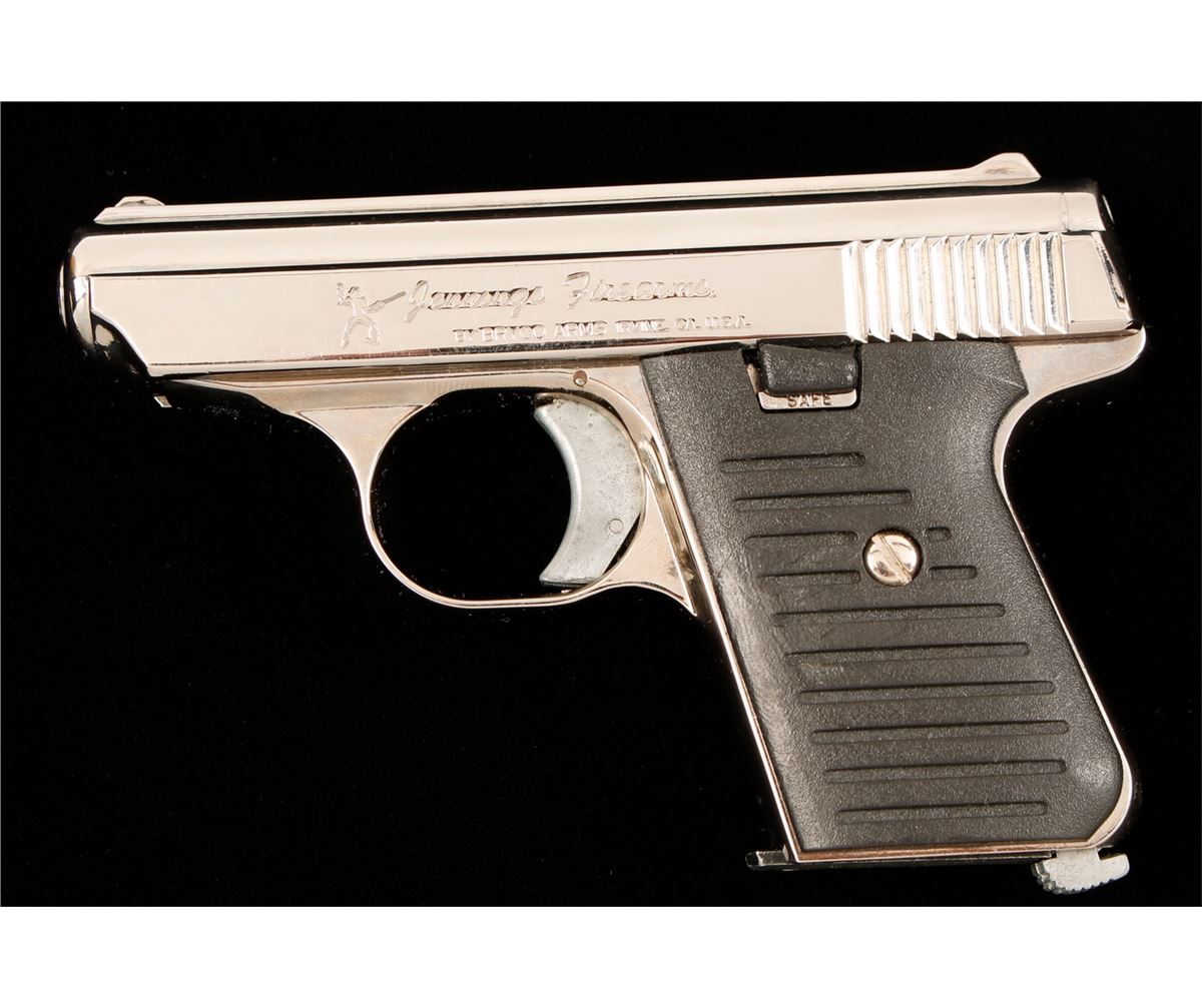 Single action semi-automatic plated pistol with one magazine. Barrel, extractor, magazine body and firing pin are the only steel pieces identifiable. Plating is very good with only some application blemishes by the trigger. Bore is dirty but bright with strong rifling. Action works well. Polymer grips are in good shape. Condition is very good.