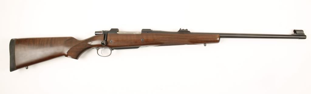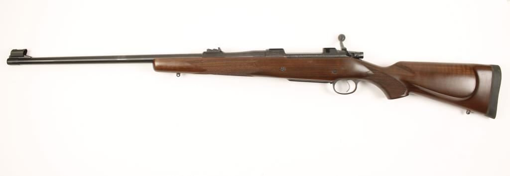 Czechoslovakian made bolt action sporting rifle chambered in .375 Holland & Holland Magnum. Features a tapered 25" blued barrel, front ramp hooded sight, standing rear sight with two express folding leaves, internal box magazine, blued receiver milled for scope rings, safety switch and checkered Bravarian-style Turkish walnut stock with swivel studs & rubber recoil pad. Bore is very good and action performs well. Condition is excellent.