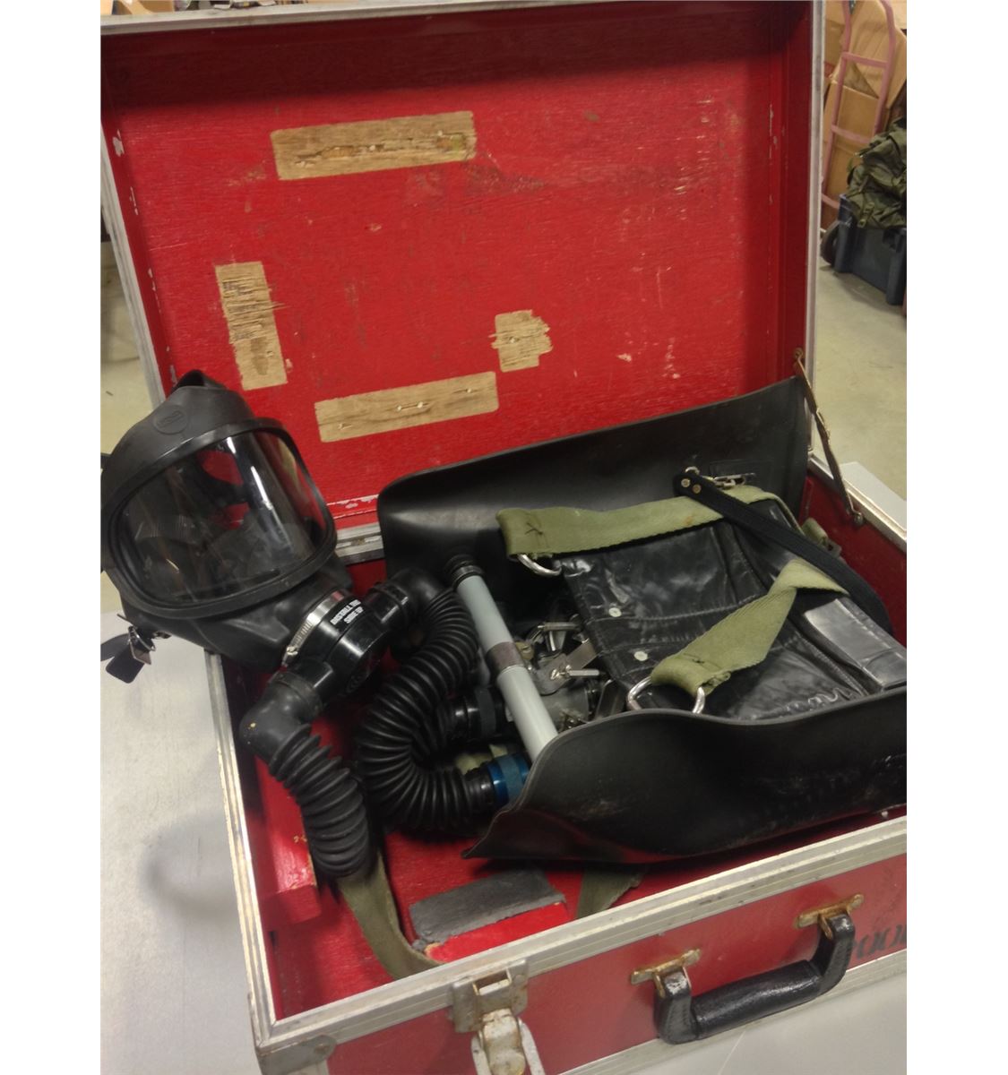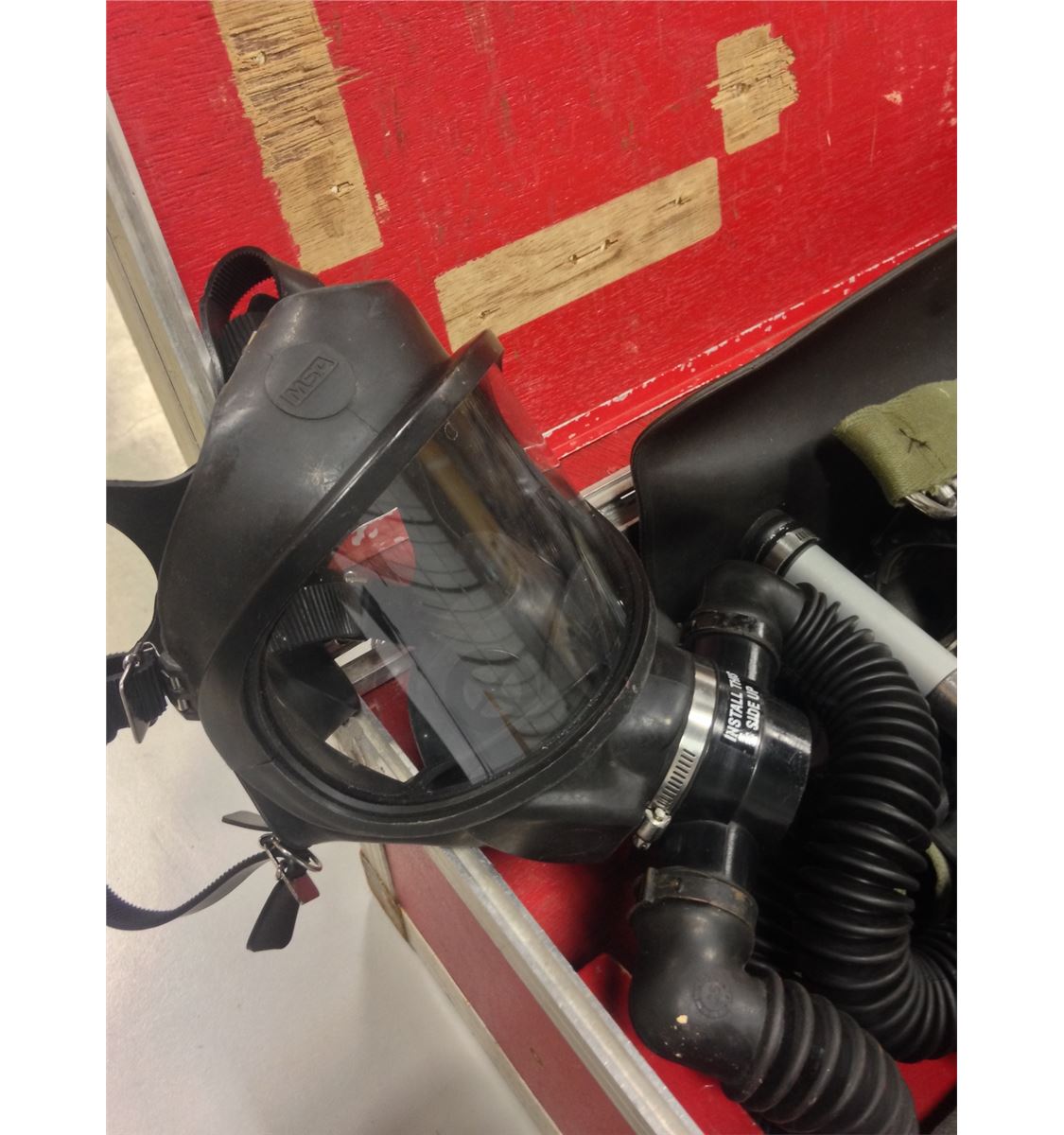 Comes in the original, MSA stamped heavy duty protective red box with hoses, mask, strapping and harness