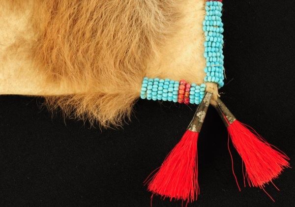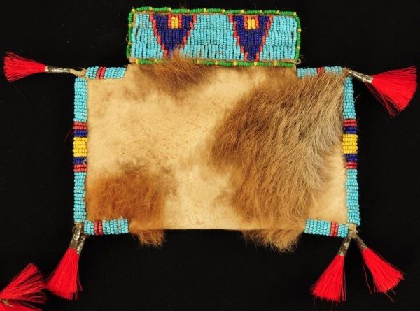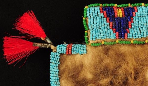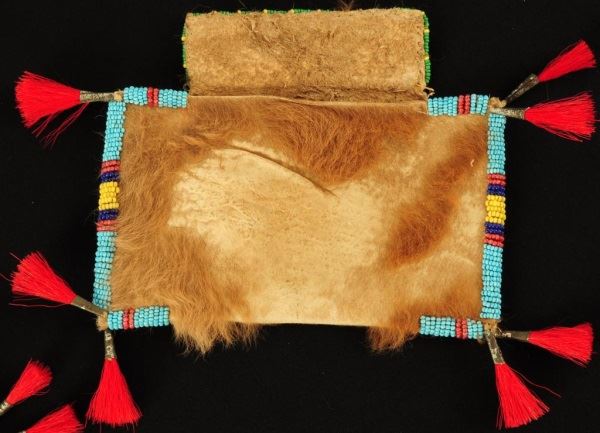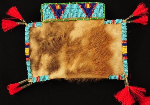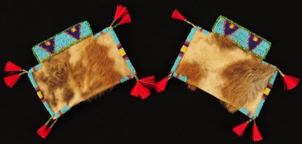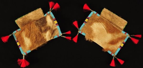 Sioux Indian. Pair of miniature possible bags. Beaded on cowhide. 5 3/4" x 3 1/2". Made as toys for children. Early 20th century.