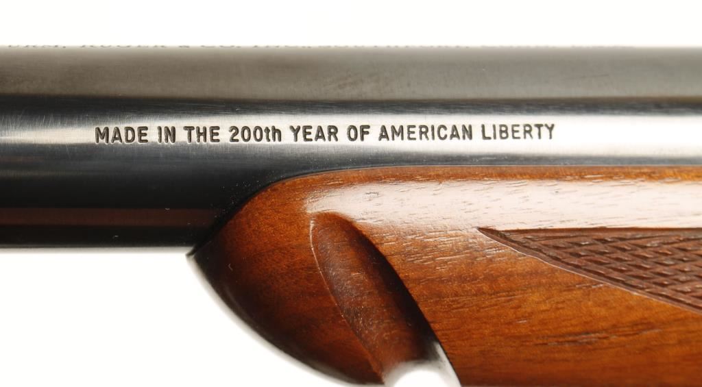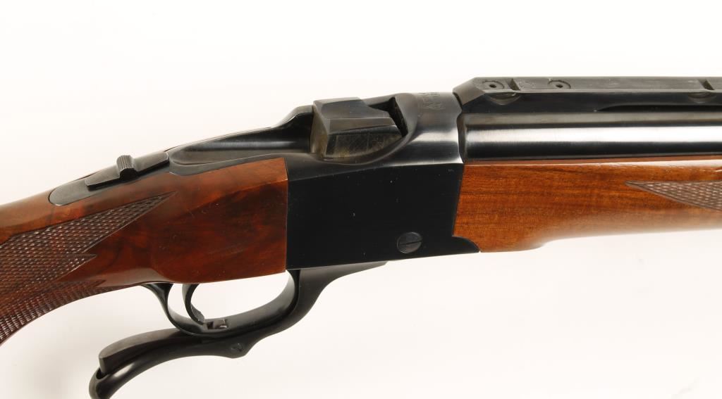 Blued single-shot drop-block rifle with a 24" barrel, quarter rib with folding leaf sight and scope base, factory sling swivels and checkered wood furniture. Made in 1976 and marked "Made in the 200th Year of American Liberty". Metal finish is faultless. Bore is immaculate. Action is flawless. Forend has Alexander Henry styling and all the wood only has small blemishes and rubs. The recoil pad is not fitting well at the toe of the butt. Action works well. Condition is excellent. *Modern Firearm*