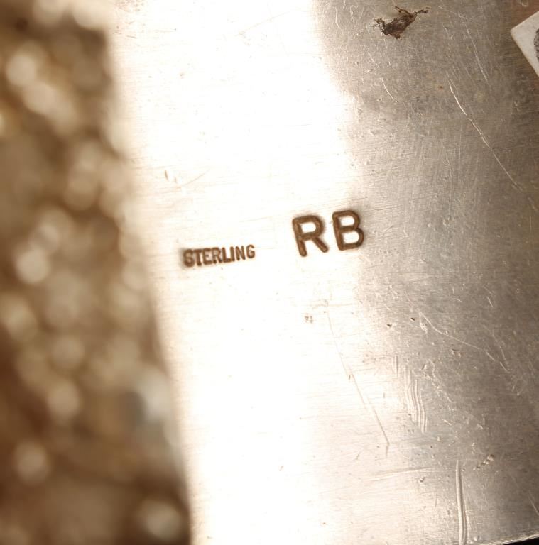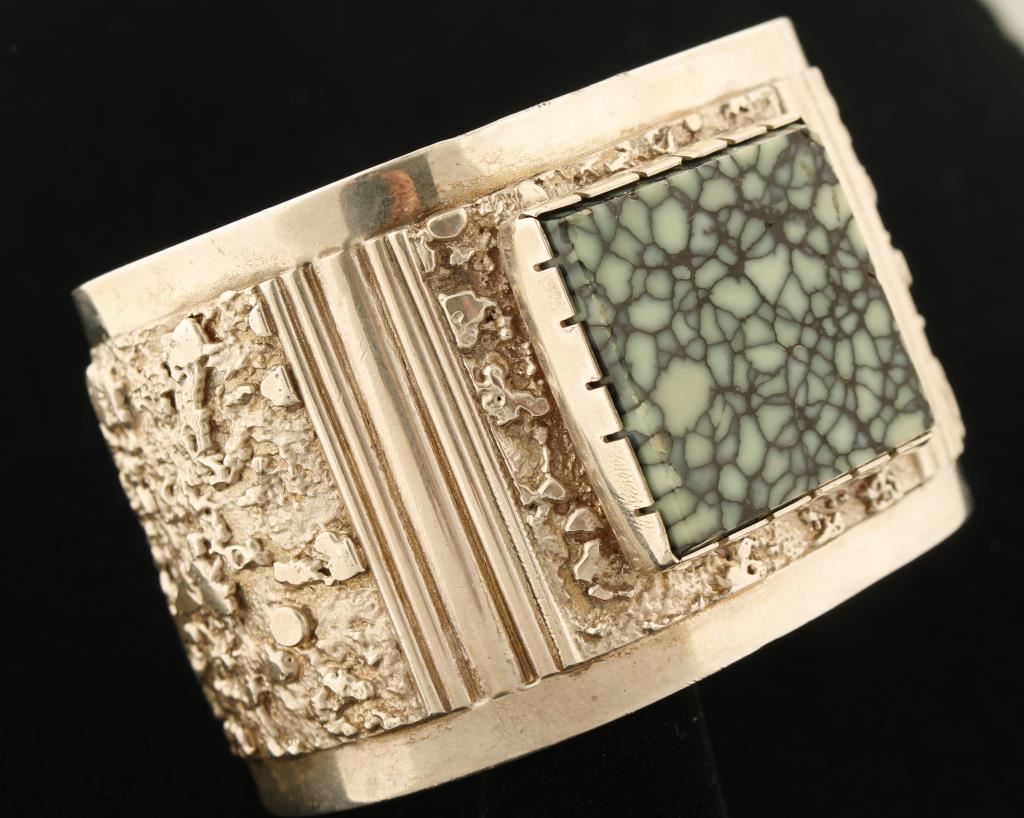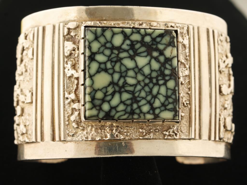 Square cut stone set in sterling on a 2" Band, 7"overall length by noted artist Richard Begay stamped "RB". Very good overall, one edge of stone is sharp. From the Charlie Myers estate noted dealer, collector and friend.