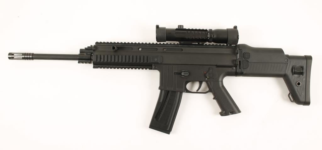 Black alloy and synthetic semi-automatic flat-top rifle with a 18-3/8" barrel (including flash hider), quad rail forend, 4-position telescoping side-folding stock, adjustable cheek rest, 2-6 power Famous Maker scope with flip up lens covers, ambi mag release and safety, one high capacity magazine. SCAR style. Metal finish has no defects. Stock has a few light rub marks. Bore is bright and shiny with sharp rifling. Action works well. Condition is excellent. *Modern Firearm*
