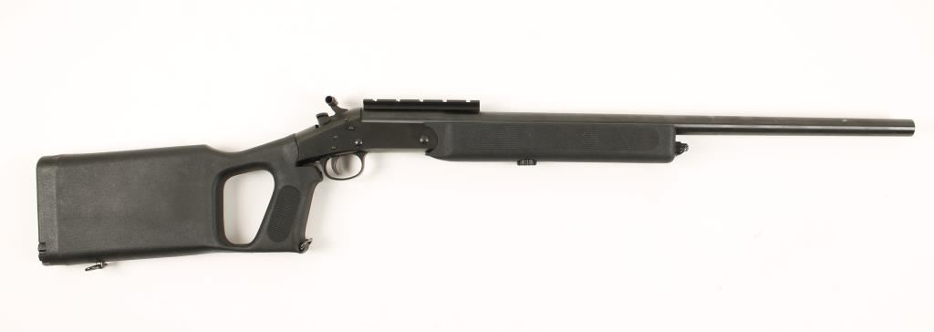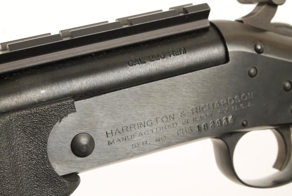 Harrington & Richardson. Blued single-shot break-open rifle with a 24" heavy barrel, recessed crown, scope rail, hammer spur extension, synthetic pistol grip furniture and sling swivels. Metal finish has a few tiny rubs. Checkered and textured synthetic stock has no defects. Bore is bright and shiny with strong rifling. Action works well. Condition is excellent. *Modern Firearm*