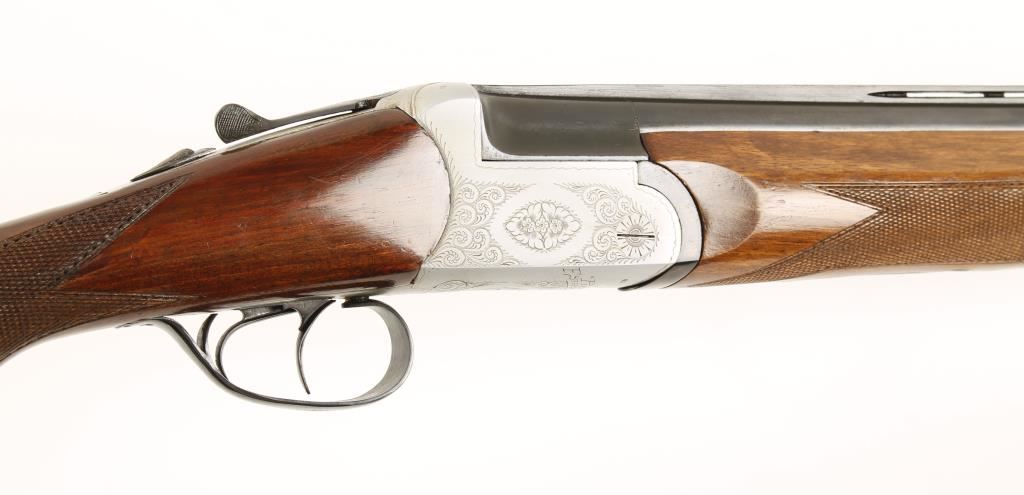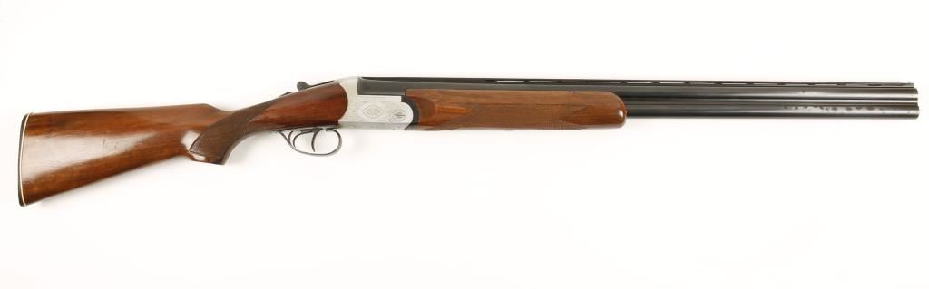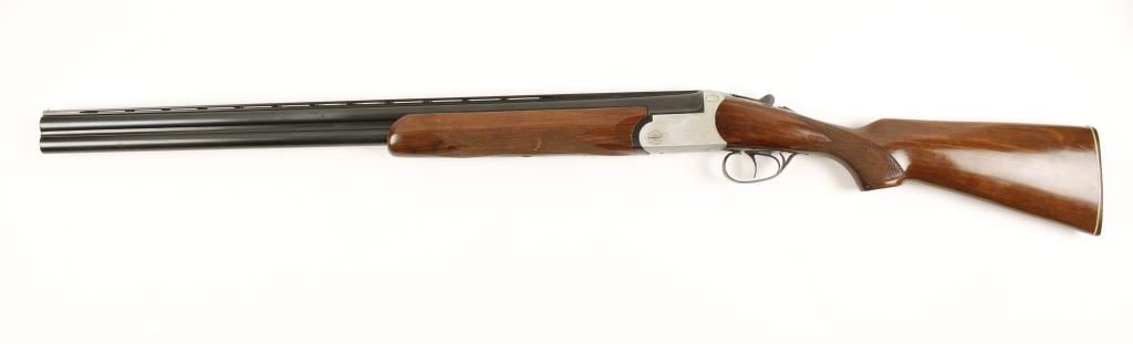 Blued and matte stainless over-under shotgun with 27-1/2" vent-rib barrels for 3" shells, Full over Improved Cylinder fixed chokes, extractors, engraved receiver, 2 triggers, automatic safety, checkered furniture with pistol grip butt stock and a basket weave style black plastic butt plate. Metal finish show some wear and fading with small areas of surface rust and light pitting. Bores are mirror bright. Action works well. Length of pull is 13-7/8" to back trigger and 14-13/16" to front trigger. Wood has small rubs, scratches and scuffs. Needs a good cleaning. Condition is very good. *Modern Firearm*