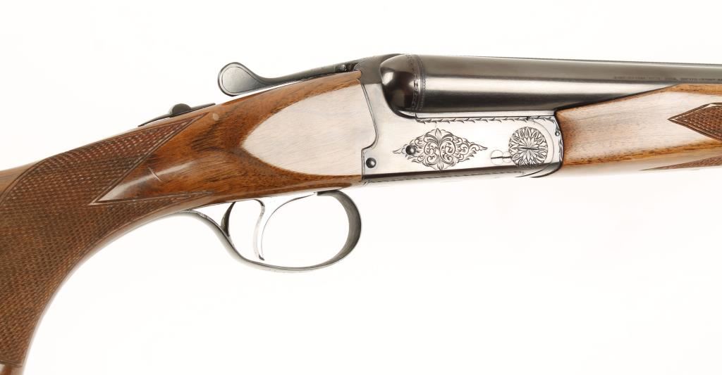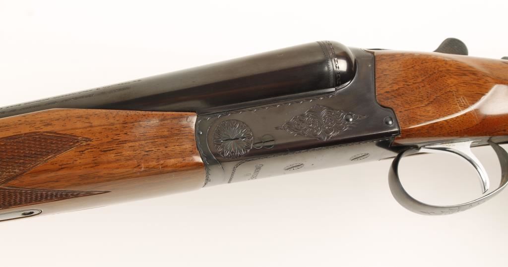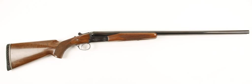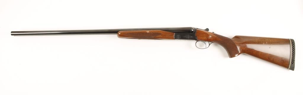 Blued and walnut double-barreled shotgun with 28" tubes chambered for 2-3/4" and 3" shells, Full and Modified fixed chokes, ejectors, single inertia trigger, automatic safety, engraved box-lock receiver and trigger guard, checkered furniture with beavertail forend and pistol grip butt stock and a Pachmayr "White Line" recoil pad. Made in Japan and assembled in Korea. Length of pull is 14-1/8". Metal finish has a few freckles of surface rust on the trigger plate and wear from the movement of the safety. Bores are bright and shiny with some build-up of something in the cone of the right tube. Wood has a a large dent on the forend and a cluster of dents on the left of the butt with a few other dings and scratches and some scuffs to the finish near the recoil pad. Action works well. Condition is good to very good. *Modern Firearm*