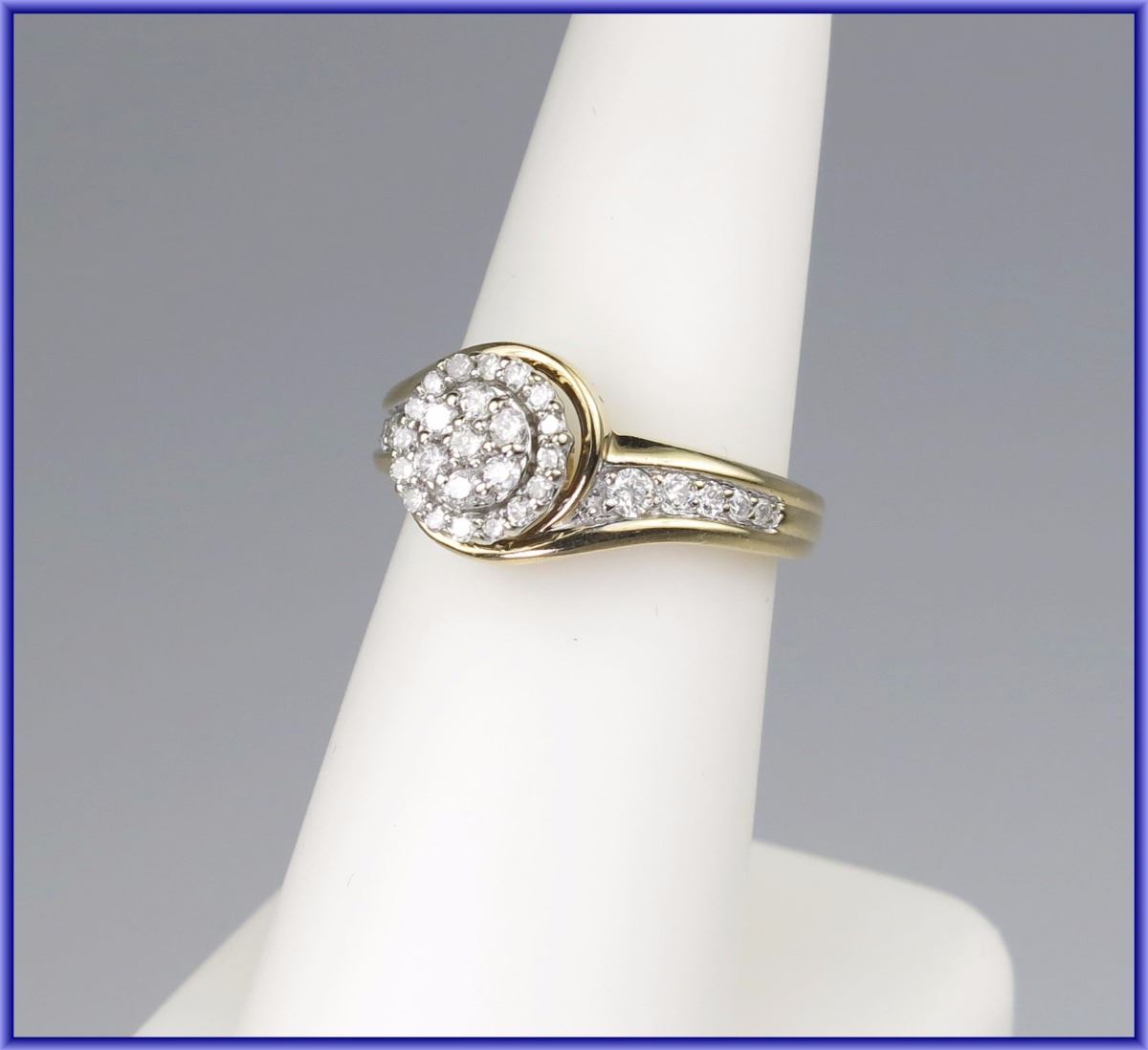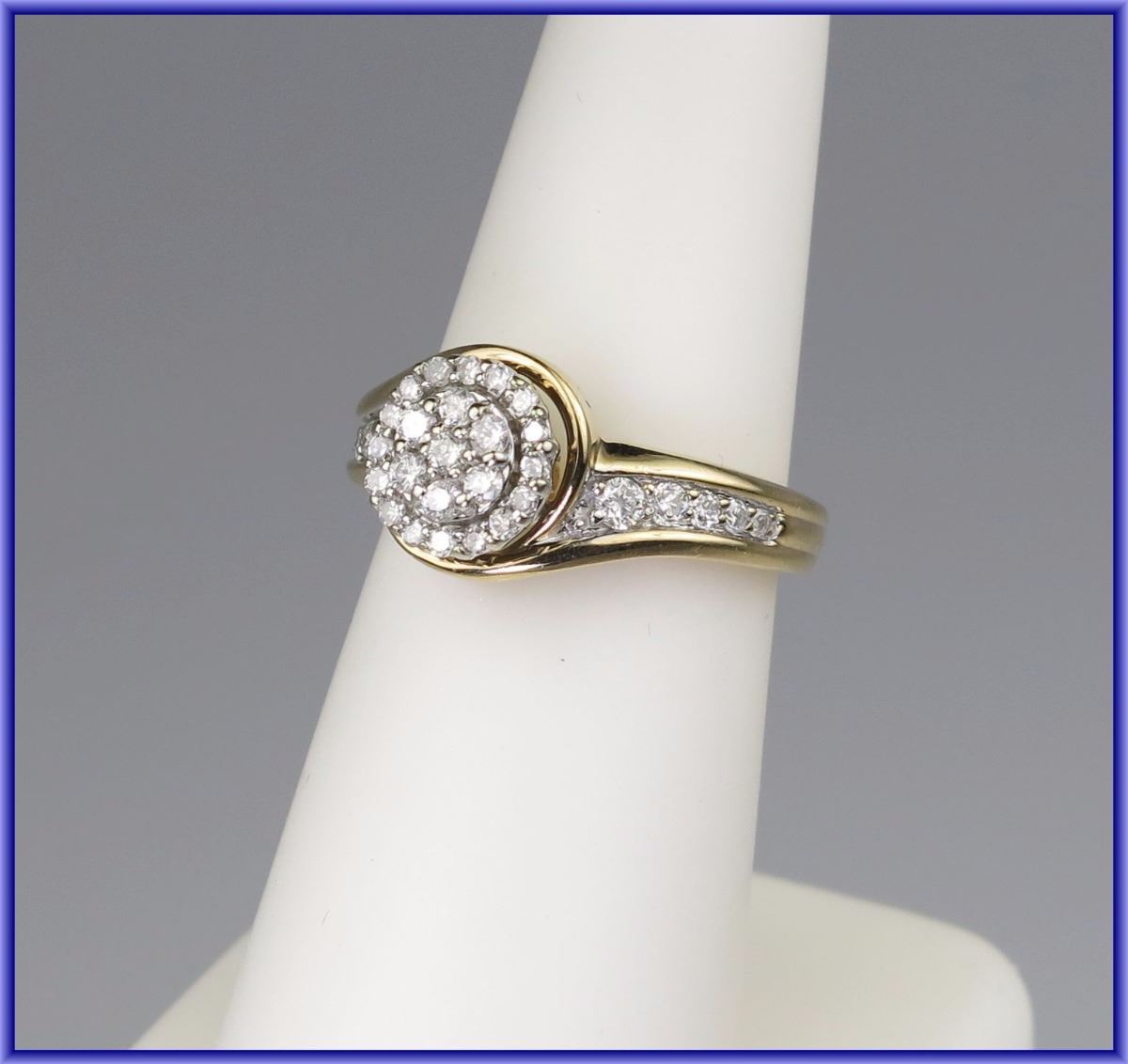 Lovely halo style setting of 33 round cut Diamonds weighing approx. 0.60 carats H-I colors and SI clarity set in 10 karat yellow gold.