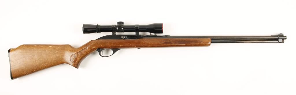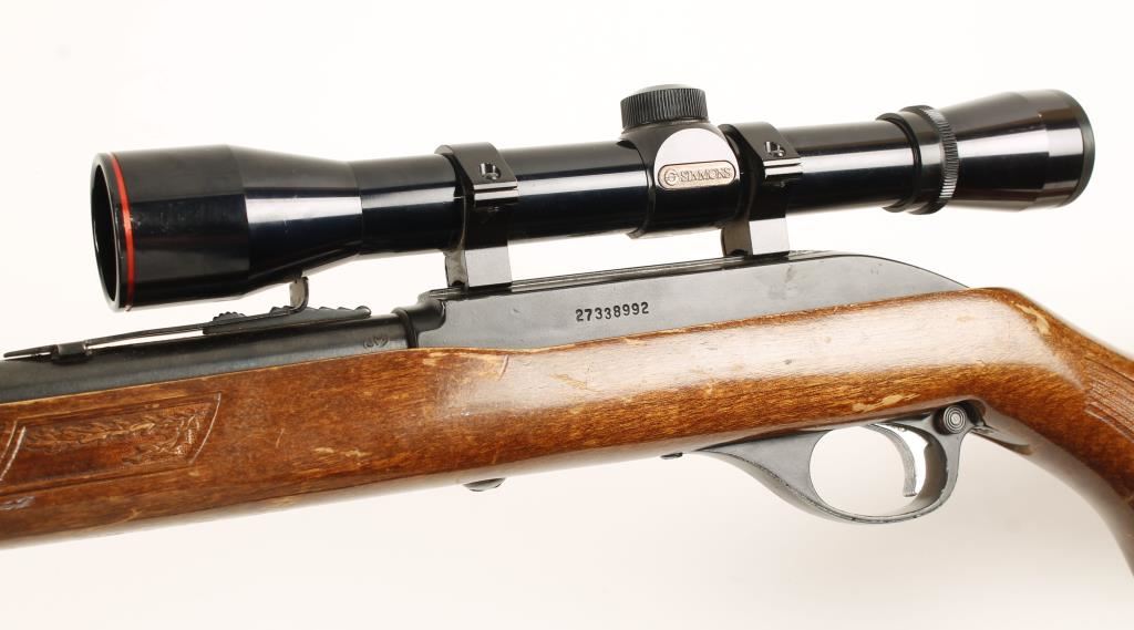 Blued and black alloy semi-automatic rifle with a 22" barrel, tube feed magazine, iron sights with rear adjustable for elevation, Simmons 4x32 WA scope and a pressed wood Monte Carlo stock with black plastic butt plate. Steel finish is faded and worn with some freckling of surface rust and small areas of pitting. Alloy receiver and trigger guard have edge wear. Bore is bright and shiny with lots of strong rifling. Action works well. Wood has numerous rubs, dings, scuffs and scrapes. Butt plate is worn with a few small dings and chips. Fixed 4 power scope has a duplex reticle and is clear. Condition is good. *Modern Firearm*