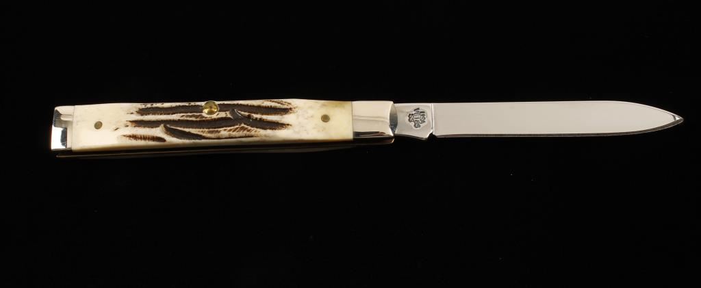 Made in 2001. Stamped "V6185 SS". "V" is for vintage style. Handles are jigged bone or Delrin. Blade is 3" long. Includes factory box with tissue paper and document. Condition is excellent.
