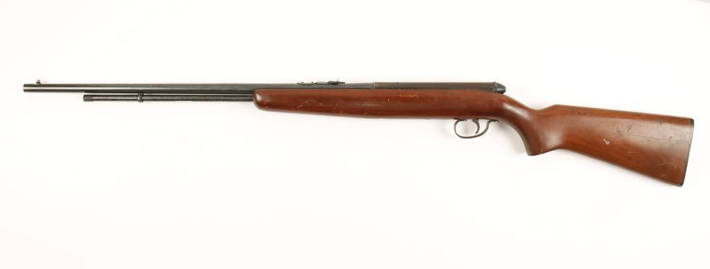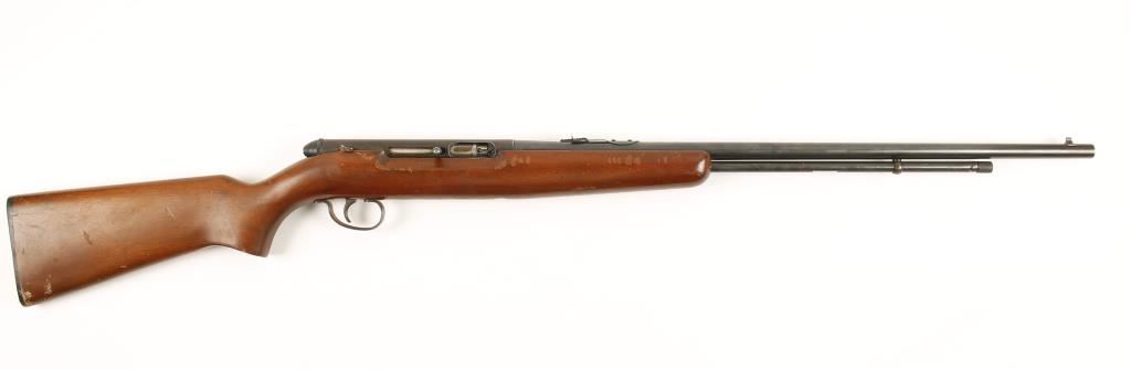 Blued semi-automatic rifle with a 24" barrel, tube magazine, iron sights with rear adjustable for elevation and front drift adjustable for windage, wood stock and black plastic butt plate. Metal finish is worn/faded with a few tiny dings, freckles of surface rust, oil build-up in spots and some edge wear. Bore is bright and shiny with rifling. Wood has dings, rubs, scratches and what may be dry cracks on the left side of the butt. Butt plate has a few scuffs and scratches. Action works well. Condition is fair to good. *Modern Firearm*