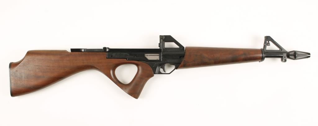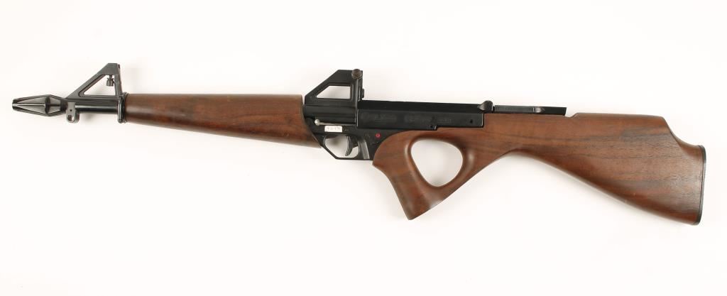 SN: D001552 Semi automatic carbine chamber in .22 Long Rifle. Features a 16.1" barrel, flash suppressor, adjustable sights, ambidextrous safety, black finished alloy frame, no magazine and walnut forearm & thumbhole pistol grip stock. Finish remain 90%+ intact with some high edge wear at the top of the frame. Bore is bright and shows rifling and action works. Condition is very good. ***Modern Firearm***