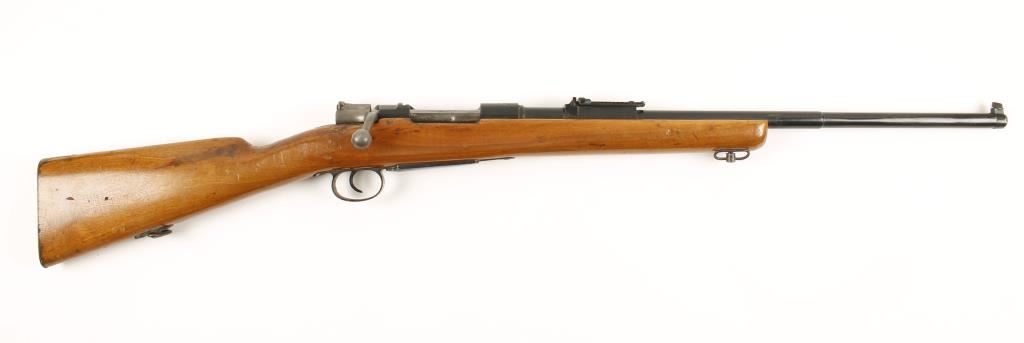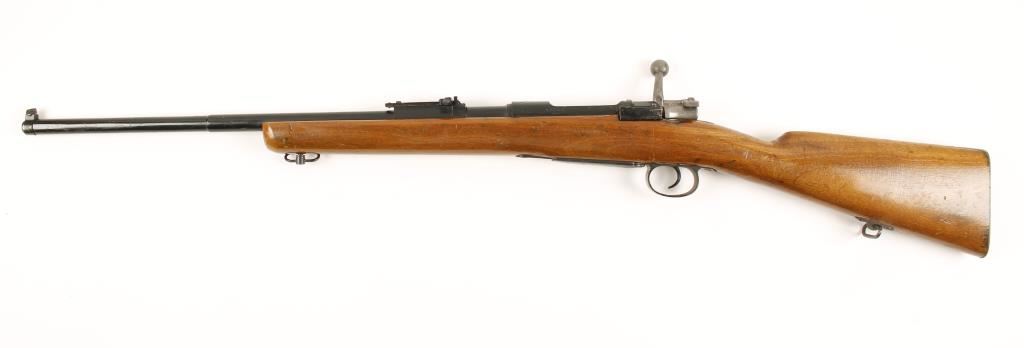Blued and in-the white Spanish military bolt-action "cocks on closing" rifle with a 21-1/2" barrel, non-detachable box magazine, iron sights adjustable for elevation (and drift adjustable for windage), sling swivels and a cut-down sporterized stock with steel butt plate. Made in 1901. Metal finish has been painted over wear and pin-prick pitting with some small dings and scuffs. Bore is dirty and frosty with strong rifling. Bolt body and shroud are in-the-white and the bolt handle has been bent down a bit. Action works well. Wood has dings, scratches, scuffs and rubs. Butt plate has some small dings and red rust forming. Condition is poor to fair. *Modern Firearm*