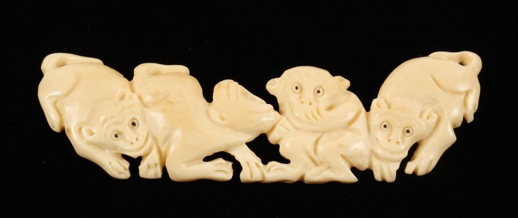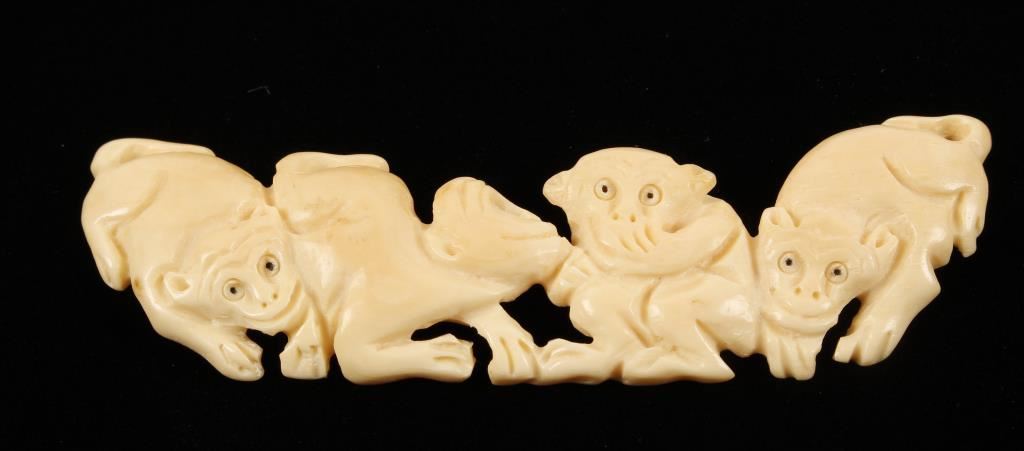 A row of mischievous carved monkeys. Measures 3-3/4" long. Back side has no detail, smooth ivory. Can only be sold in the state of Arizona by law and commerce, cannot be shipped.