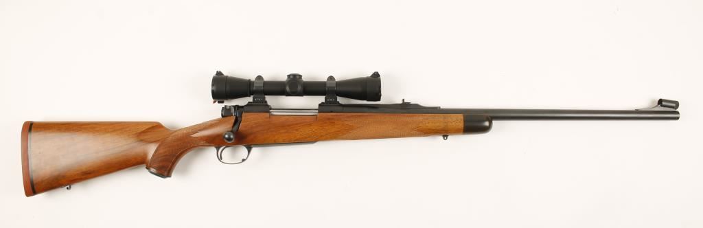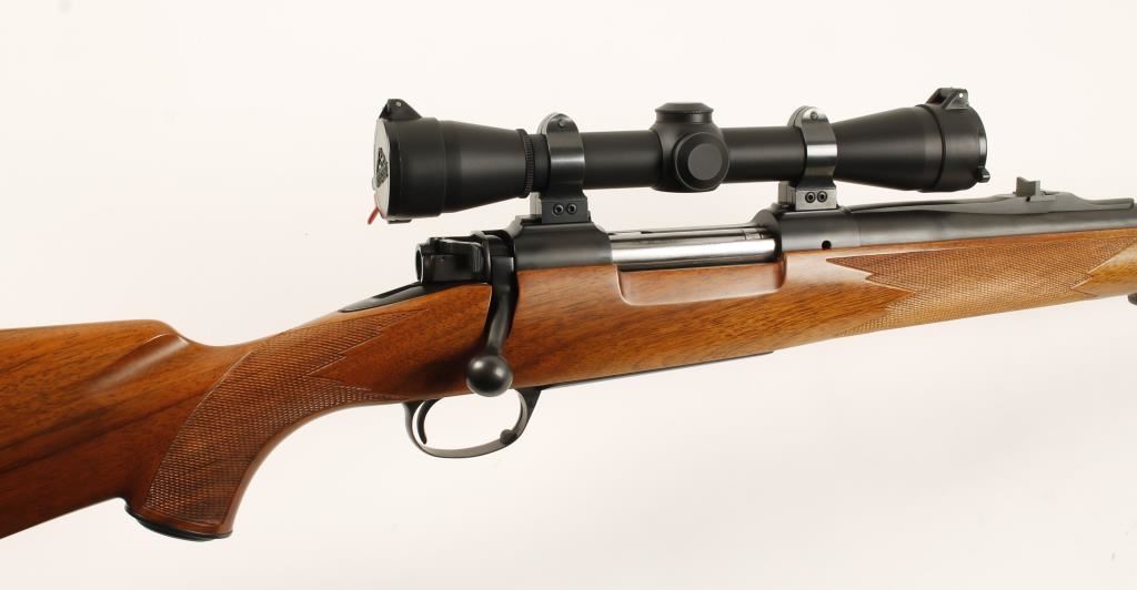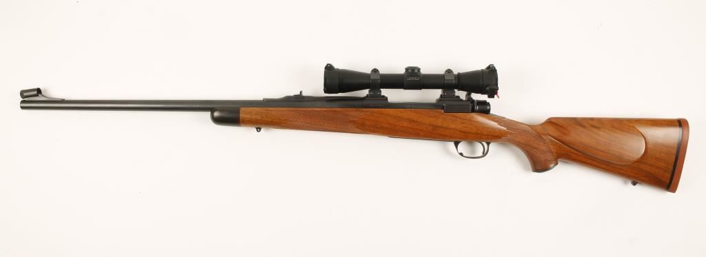 Made in Oregon. Blued bolt-action controlled round feed with a 24" barrel, Leupold M8 4x scope, quarter rib with rear folding leaf sight, hooded front sight, hinged floorplate, 3-position side swing safety and checkered wood stock with recoil pad. Metal finish has tiny rubs on the floorplate, trigger guard and left side of receiver. Bore is bright and shiny with sharp rifling. Safety works well and action functions flawlessly. Optics are clear and there are Butler Creek flip-up lens covers. Wood stock has a small ding near the forend tip and a rub on the forend tip. Condition is excellent. *Modern Firearm*