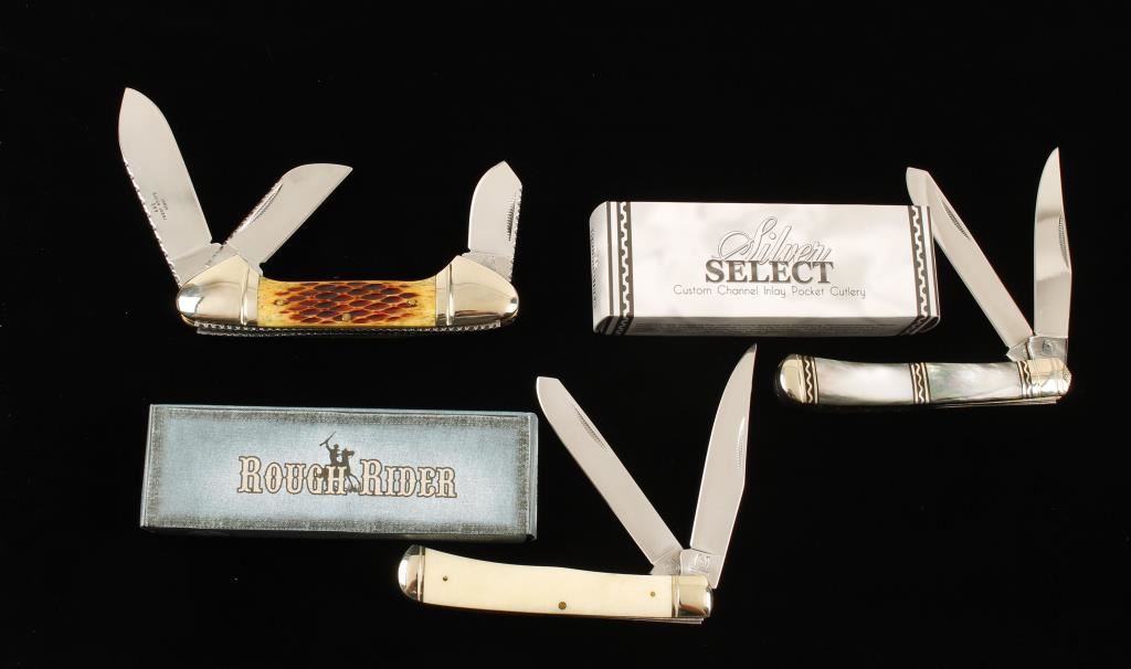1) Three bladed "Canoe" 4-9/16" closed and 7-9/16" open. Jigged bone scales. Includes black display box. 2) "Silver Select Channel Inlay" series. "Trapper" style 4-1/8" closed and 7-3/8" open. Scales are mother-of-pearl. Includes factory box. 3) "Trapper" style with white smooth bone scales. 4-1/8" closed and 7-3/8" open. Includes factory box. Condition is excellent.