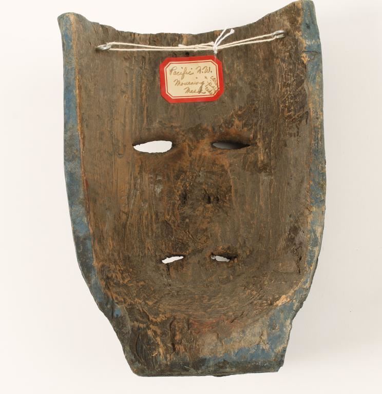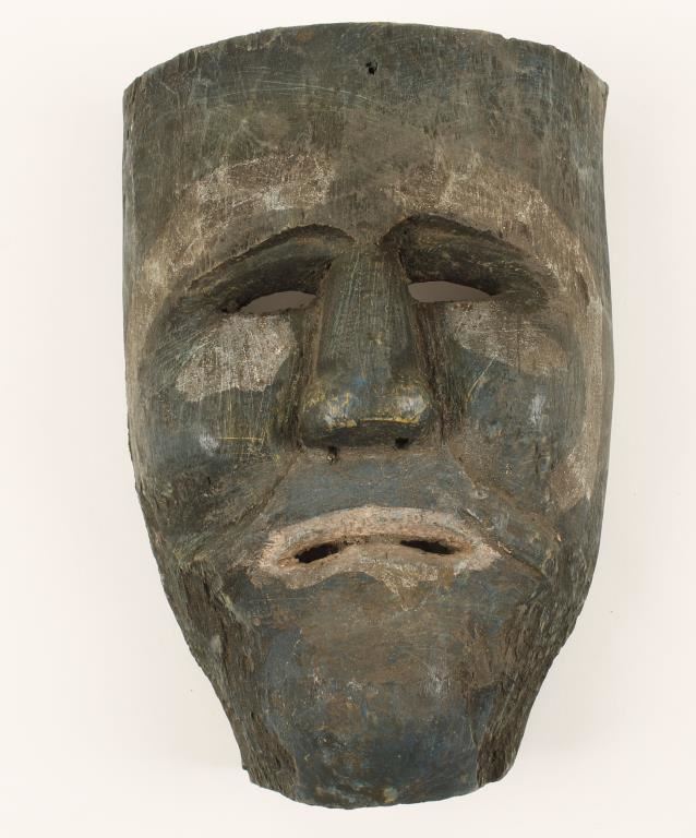 Carved wood mask with painted face showing white, blue, yellow and green colors. Has eye hooks and string for hanging. Condition is very good as antique.