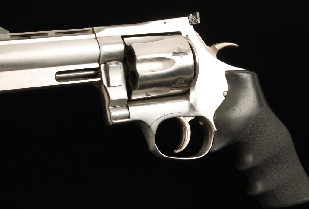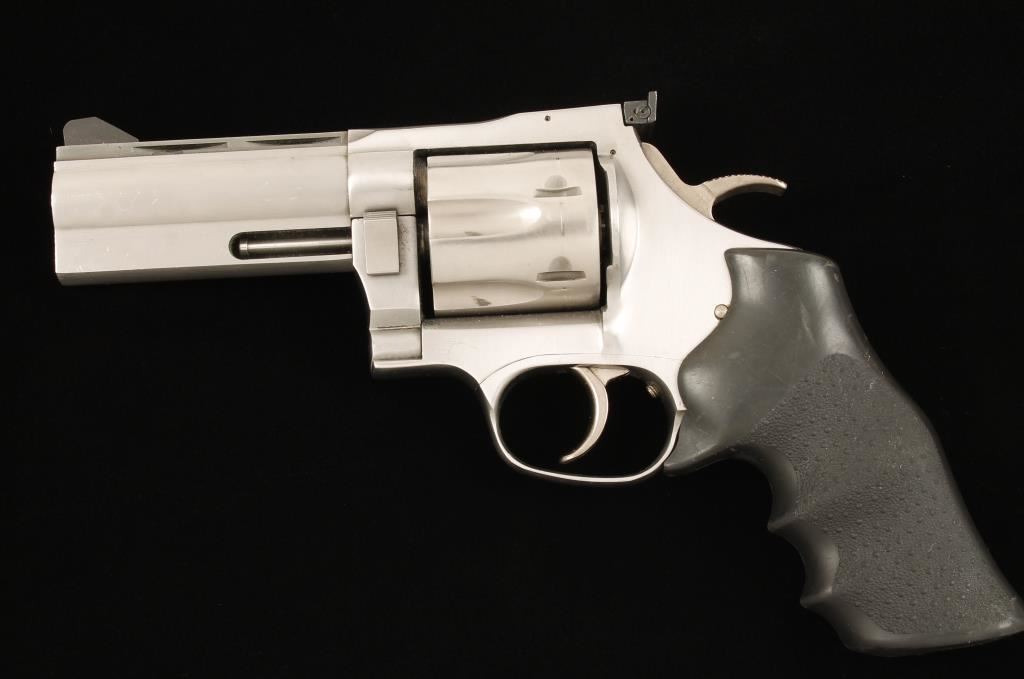 Stainless steel double-action 6-shot revolver with a 4" vent rib barrel (interchangeable), adjustable rear sight and Hogue Monogrip rubber grip. Made in Monson, Mass. Metal finish shows a heavy drag line, many rubs and a few tiny dings and scratches in the brushed finish. Bore is shiny with plenty of good sharp rifling. Chambers are shiny. Grip has scuffs. Cylinder front and flutes have powder residue buildup. Action is very smooth but lock-up is a little loose. Condition is good to very good. *Modern Firearm*