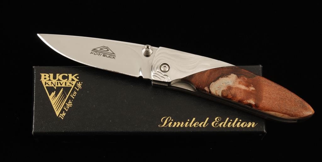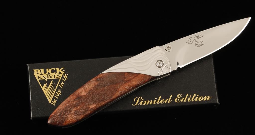 Limited Edition single blade with 3-1/8" closed and 5-7/16" open length. Scales are Quincewood. Blade is etched "Koji/Buck" on one side and "BOS ATS-34 U.S.A." on the other. Bolsters are stepped stainless steel. Includes factory Limited Edition box and document. Condition is excellent.